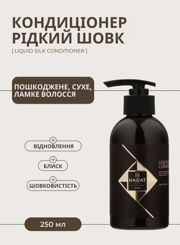 Hadat Liquid Silk Conditioner — восстанавливающий кондиционер с технологией Sea Oil Silk для сухих, поврежденных и тусклых волос; глубоко проникает в структуру, насыщая биоактивными протеинами шелка и кератином, разглаживает кутикулу и обеспечивает интенсивное увлажнение, подходит для всех типов, включая окрашенные и после стайлинга, защищает от термического воздействия и внешних факторов без парабенов и сульфатов.