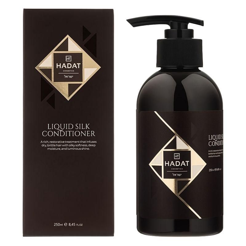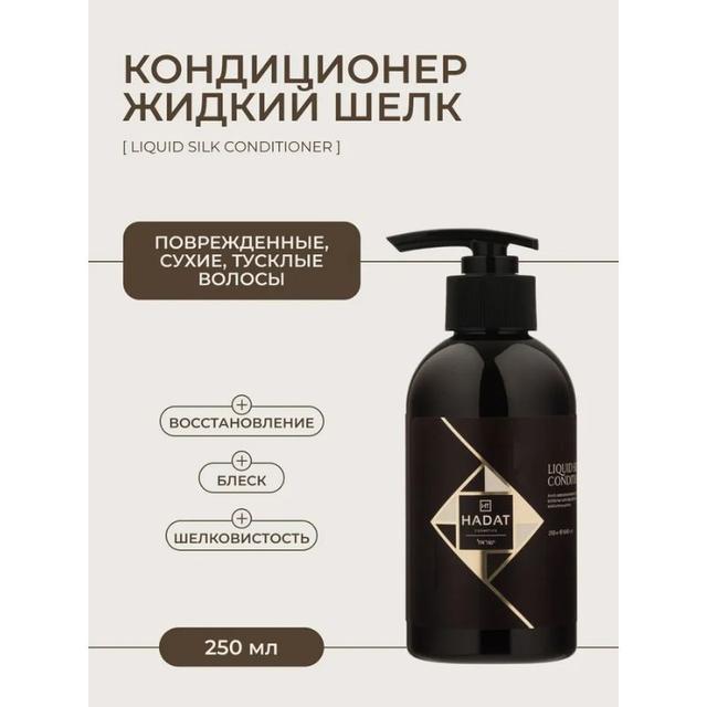 Hadat Liquid Silk Conditioner — восстанавливающий кондиционер с технологией Sea Oil Silk для сухих, поврежденных и тусклых волос; глубоко проникает в структуру, насыщая биоактивными протеинами шелка и кератином, разглаживает кутикулу и обеспечивает интенсивное увлажнение, подходит для всех типов, включая окрашенные и после стайлинга, защищает от термического воздействия и внешних факторов без парабенов и сульфатов.