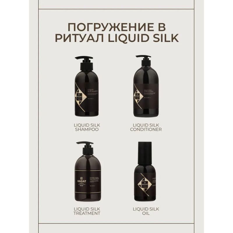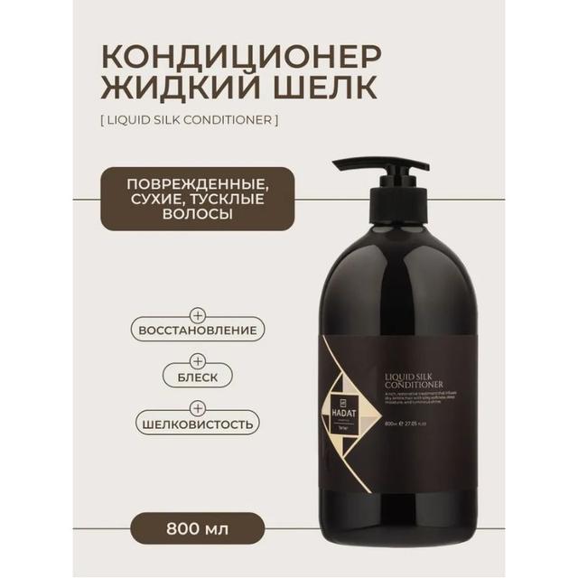 Hadat Liquid Silk Conditioner — восстанавливающий кондиционер с технологией Sea Oil Silk для сухих, поврежденных и тусклых волос; глубоко проникает в структуру, насыщая биоактивными протеинами шелка и кератином, разглаживает кутикулу и обеспечивает интенсивное увлажнение, подходит для всех типов, включая окрашенные и после стайлинга, защищает от термического воздействия и внешних факторов без парабенов и сульфатов.