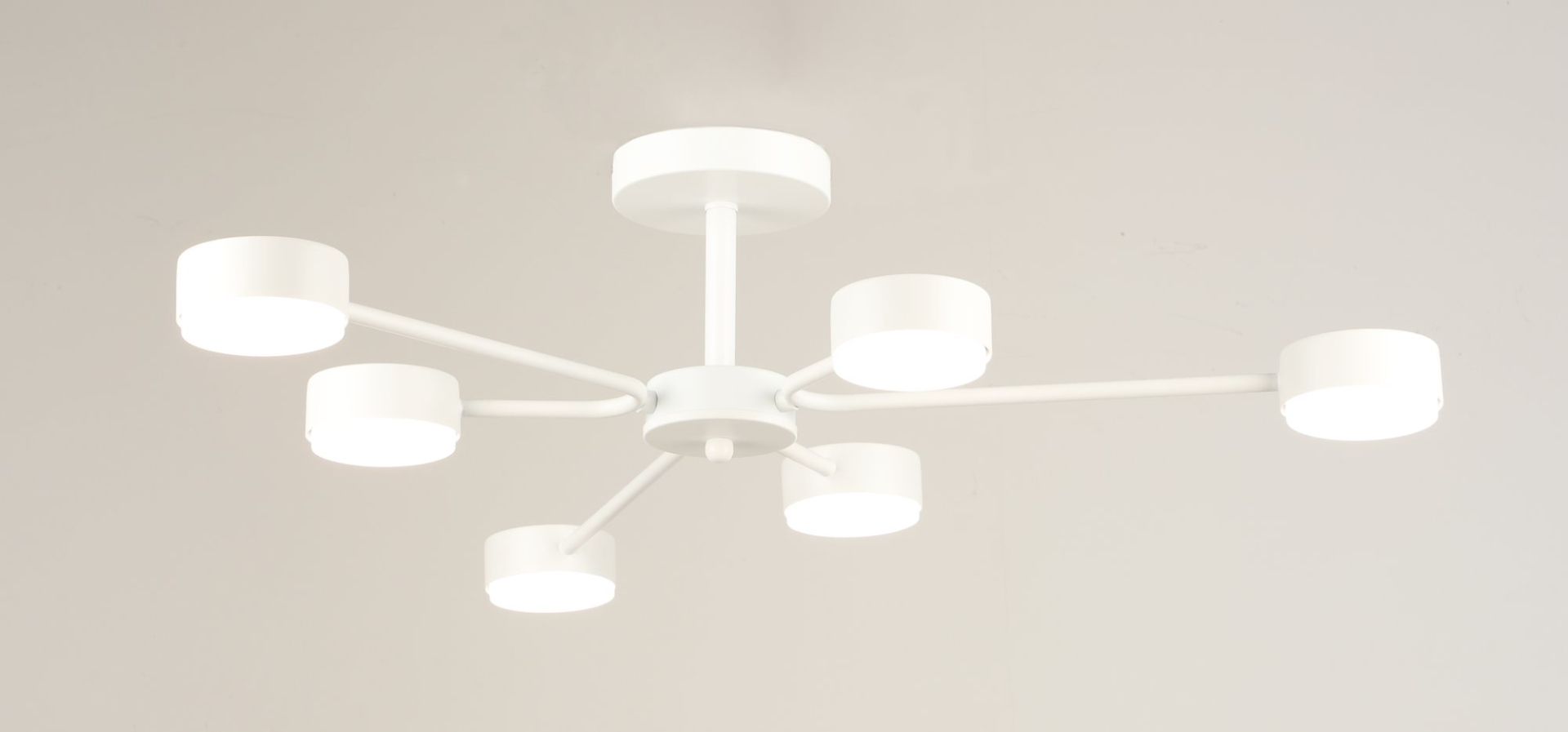 Люстра выполнена из прочного металла в чистом белом цвете, что делает ее визуально легкой и незаметной, сохраняя при этом высокую функциональность. Шесть источников света, расположенные по периметру, обеспечивают мощное и равномерное освещение большой площади. Модель использует патроны типа GX53, которые являются идеальными для современных, энергоэффективных LED-ламп.