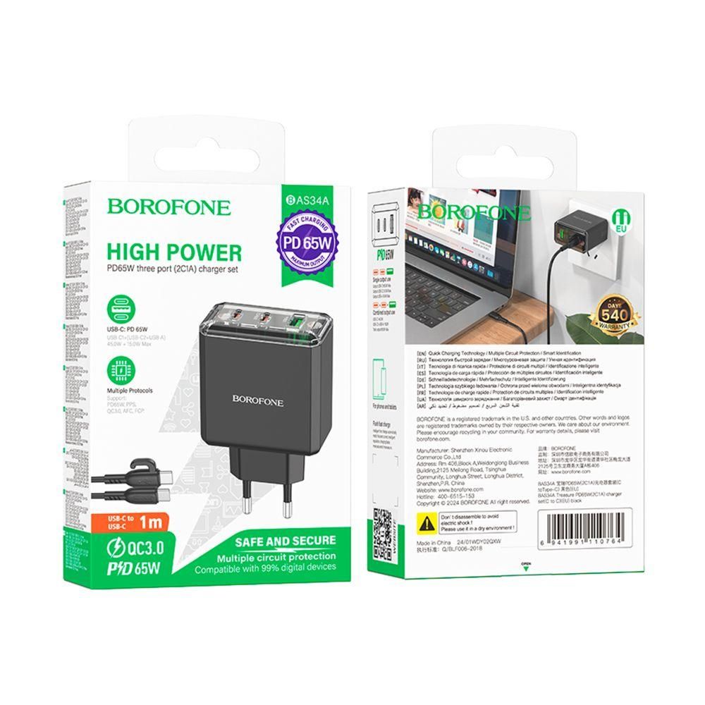Сетевое Зарядное Устройство Borofone BAS34A 2Type-C/1USB PD/QC 65W Type-C to Type-C Цвет Белый