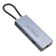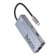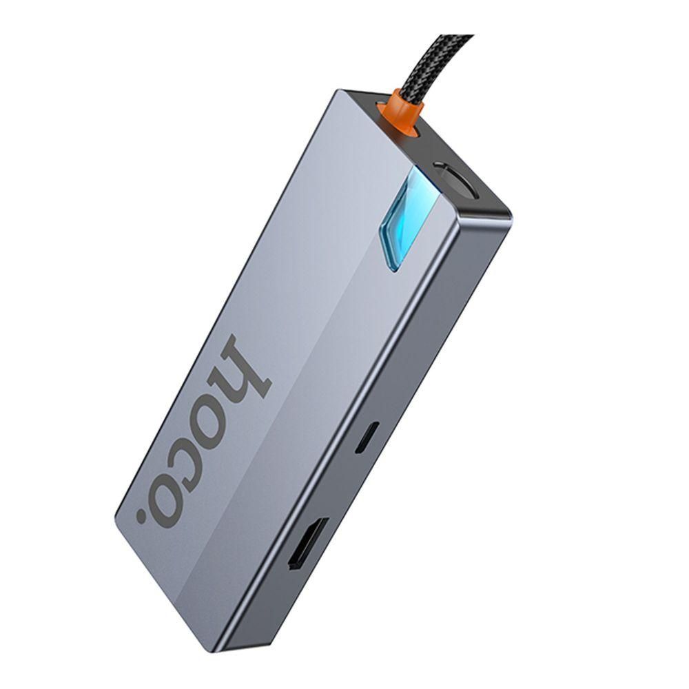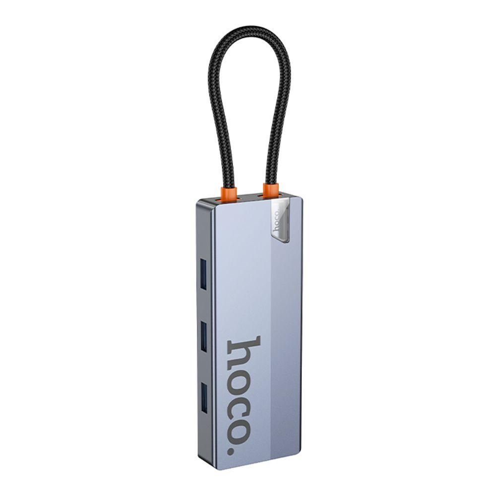 USB Hub Hoco HB51 Type-C 6-in-1 — это многофункциональный переходник, разработанный для расширения возможностей устройств с портом Type–C, предоставляющий шесть различных интерфейсов в одном компактном корпусе. Он позволяет легко подключать разнообразные периферийные устройства и внешние мониторы, обеспечивая быструю передачу данных, стабильное сетевое соединение и удобство зарядки. Особенности и преимущества USB хаба Hoco HB51 Type-C 6-in-1: • Современный, практичный дизайн с удобно расположенным функционалом, стильными и яркими элементами. • Компактные размеры: 113×44×15.5мм, — не займёт много места на рабочем столе или в сумке вместе с ноутбуком. • Надёжный корпус из алюминиевого сплава и внешняя оплётка встроенного кабеля длиной 18см из поливинилхлорида (PVC). • Входной разъём кабеля Type–C (male) и слот для его фиксации, который обеспечивает удобную переноску и упрощает хранение. • 5 выходных разъёмов типа female, которые могут использоваться одновременно, а именно: HDMI, Type–C PD, RJ45 и 3×USB 3.0. • Поддержка передачи видео в формате 4K с частотой 60Hz через разъём HDMI. • Поддержка быстрой зарядки по протоколу PD с максимальной мощностью 100W через разъём Type–C. • Поддержка передачи данных со скоростью до 5Gbps через разъёмы USB 3.0. • Поддержка проводного подключения к интернету или локальной сети со скоростью до 100Mbps через разъём RJ45. • Широкая совместимость с современными устройствами, оснащёнными разъёмом Type–C: смартфонами, планшетами, ноутбуками, настольными ПК, смарт ТВ. Хаб HB51 отличается продуманной конструкцией и широким набором интерфейсов, позволяя эффективно работать с периферией, зарядкой и сетью в одном устройстве.
