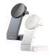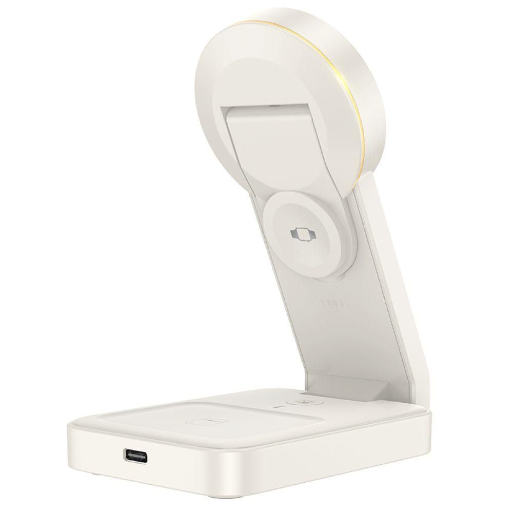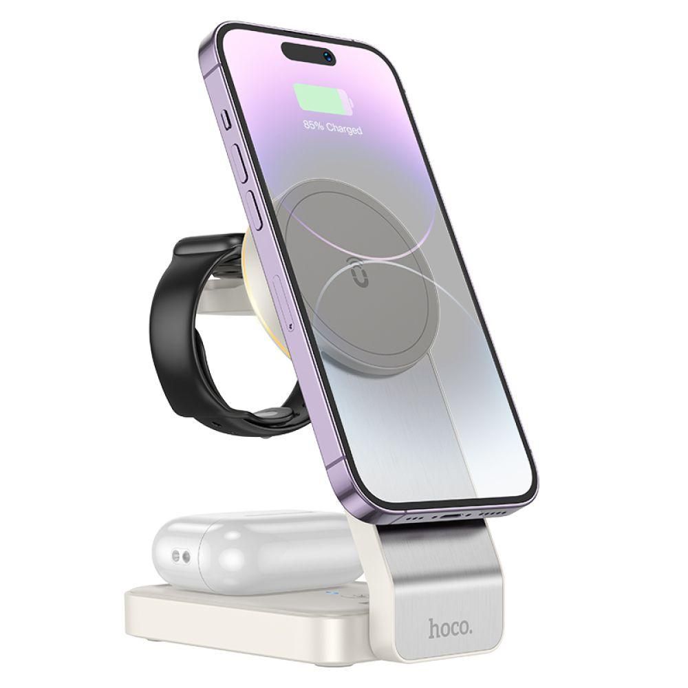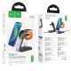 Беспроводное зарядное устройство Hoco CQ3 3-in-1 Magnetic 15W IP Version – это универсальная, функциональная док-станция для одновременной беспроводной зарядки сразу трех совместимых гаджетов: смартфона, беспроводных наушников и смарт часов. Аксессуар привлекает внимание оригинальным, изысканным дизайном, имеет небольшие размеры и практичную складную конструкцию. Он не займет много места на рабочем столе или прикроватной тумбочке, лаконично впишется в любой интерьер. При необходимости, его можно компактно сложить для безопасной транспортировки или хранения. Корпусные детали устройства качественно собраны, изготовлены из прочной комбинации поликарбоната, ABS пластика и алюминиевого сплава, что в сочетании с надежными электронными компонентами гарантирует длительный срок службы и стабильный процесс беспроводной зарядки гаджетов, поддерживающих технологию Qi. На его нижней панели имеются противоскользящие накладки и перфорация для эффективного отвода тепла. Основная складная панель устройства предназначена для зарядки смартфона, может использоваться в качестве подставки для iPhone с поддержкой технологии MagSafe. Мощность на ее выходе составляет 5, 7.5, 10 и 15W. На ее задней панели находится складная "полочка" для зарядки Apple Watch 1-8 поколений и их версий SE/SE2 с максимальной мощностью 2.5W. Зарядка зарядного кейса беспроводных наушников с мощностью 5W осуществляется на верхней панели основания аксессуара, где имеется небольшое углубление для него. Общая максимальная мощность на выходе составляет 15W. Модель дополнена стильной LED подсветкой и кнопкой для ее включения, что сделает ее использование еще более удобным в условиях недостаточной освещенности. Разъем Type-C и комплектный кабель помогут подключить устройство к источнику питания с силой тока на выходе 3A при напряжении 5 и 9V.