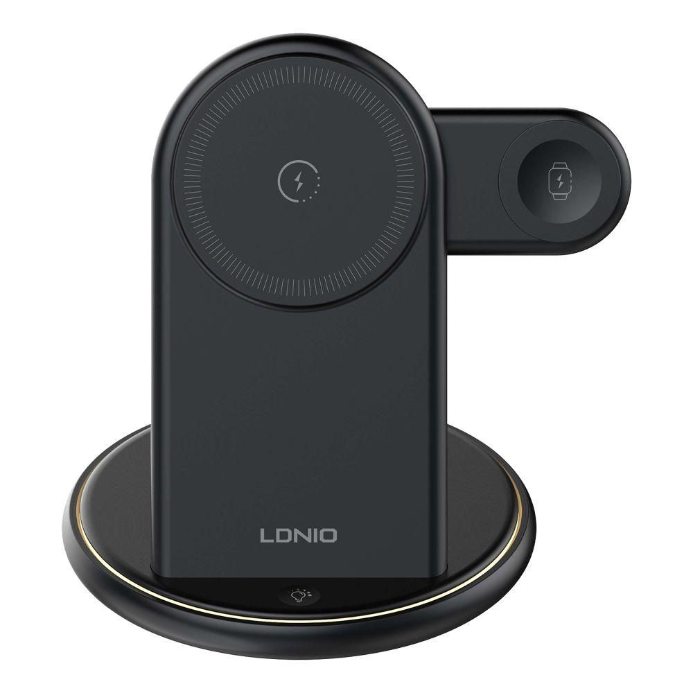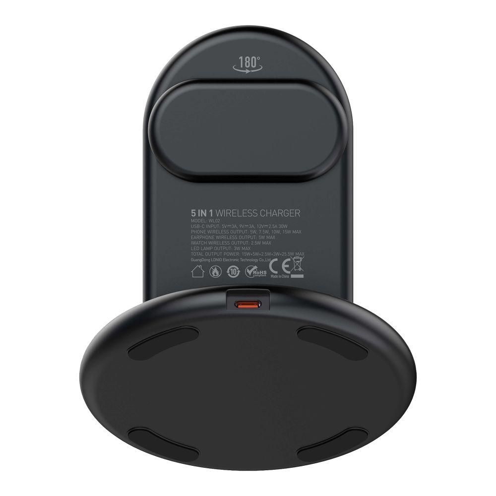Беспроводное зарядное устройство LDNIO WL02 5in1 — это комплексное решение для одновременной зарядки нескольких гаджетов, включая смартфоны, наушники и умные часы Apple Watch. Его универсальная конструкция позволяет эффективно и безопасно пополнять энергию устройств, оптимизируя пространство на рабочем столе или прикроватной тумбочке. Особенности и преимущества зарядного устройства LDNIO WL02 5in1: • Изысканный дизайн, выполненный в классическом черном цвете со стильными обтекаемыми деталями. • Компактные размеры: 13×12×12см, — не занимает много места, лаконично вписываясь в любой интерьер. • Качественные электронные компоненты и надёжная сборка корпусных деталей из поликарбоната и ABS–пластика. • Противоскользящие накладки круглого основания для устойчивой установки на любой горизонтальной поверхности. • LED–окантовка верхней панели мощностью 3W с приятным светом и сенсорным управлением для использования в качестве ночника. • Функция держателя с 17 мощными магнитами N52 для удобной и надёжной фиксации совместимых смартфонов. • Площадка на верхней панели основания для беспроводной зарядки кейса совместимых TWS–наушников с мощностью до 5W. • Магнитная беспроводная зарядка для смартфонов с широкой вариативностью выходной мощности (5, 7.5, 10 и 15W). • Магнитный держатель с шарнирной конструкцией для удобной фиксации и беспроводной зарядки Apple Watch с мощностью до 2.5W. • Общая максимальная мощность на выходе: 22.5W (15W+5W+2.5W+3W). • Разъём Type–C для подключения к источнику питания с поддержкой технологий быстрой зарядки и выходной мощностью 30W (5V/3A, 9V/3A и 12V/2.5A). • Многоуровневая система защиты и функция определения посторонних металлических предметов. Беспроводное зарядное устройство LDNIO WL02 5in1 удачно сочетает в себе надёжность, практичность и современный подход к организации зарядки в домашних или офисных условиях.