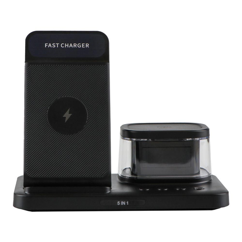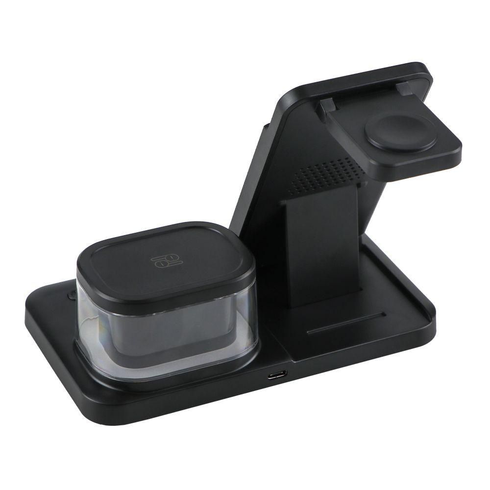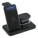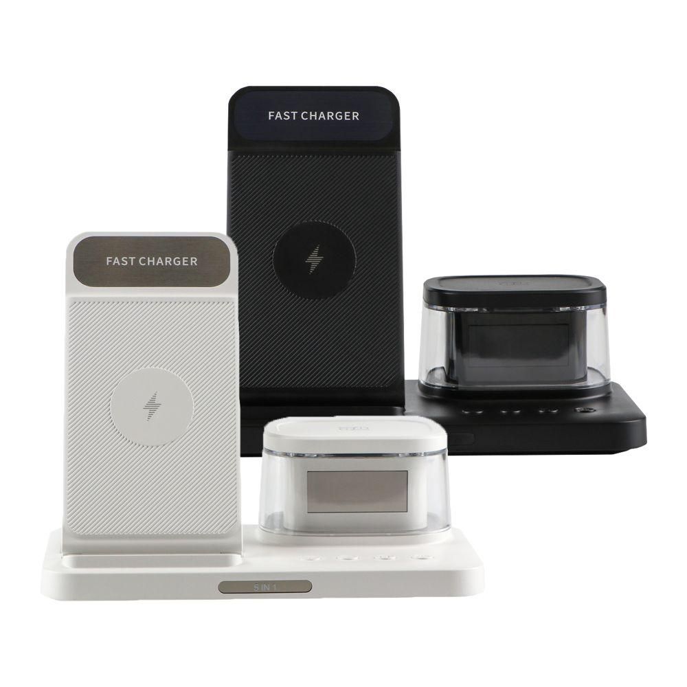 Беспроводное зарядное устройство H33 5in1 15W IP version – это многофункциональная зарядная станция, которая значительно упростит процесс беспроводной зарядки современных смартфонов, iPhone, Air pods, iWatch, а также предоставит некоторые другие полезные возможности. Она поддерживает одновременную зарядку трех гаджетов (смартфон, часы, наушники), оснащена цифровыми часами и ночным светильником. Такой широкий функционал делает ее отличным выбором для использования как дома, так и в офисе. Благодаря современному дизайну и компактным размерам, она лаконично впишется в любой интерьер и не займет много места, например, на рабочем столе или прикроватной тумбе. Корпус устройства надежно собран, изготовлен из прочной комбинации поликарбоната, ABS пластика и алюминиевого сплава. Перфорация на его панелях обеспечивает эффективный отвод тепла, а силиконовые накладки на основании – устойчивость на любой горизонтальной поверхности. Его складная подставка для смартфона поможет расположить гаджет под углом 0, 55 или 65° и оснащена двумя встроенными катушками для удобного просмотра видео или совершения звонков во время зарядки как в горизонтальном, так и вертикальном положениях. Складная "полочка" для зарядки iWatch (1-8, SE и Ultra) расположена в ее верхней части. Часы с качественным LED дисплеем находятся в модуле с прозрачной оболочкой, которая в сочетании с приятным для глаз светом ночника создает завораживающий световой эффект. На верхней панели данного модуля находится площадка для зарядки совместимых AirPods. Также, устройство оснащено LED индикаторами, механическими кнопками для настройки часов и разъемом для подключения к источнику питания. Беспроводная зарядка смартфонов и iPhone с поддержкой технологий Qi и MagSafe осуществляется на дистанции до 5мм. Общая максимальная мощность на выходе составляет 15W, входное напряжение – 9V при силе тока 2A (QC) и 9V при 2.22A (PD). В комплект к устройству входят кабель Type-C и инструкция.
