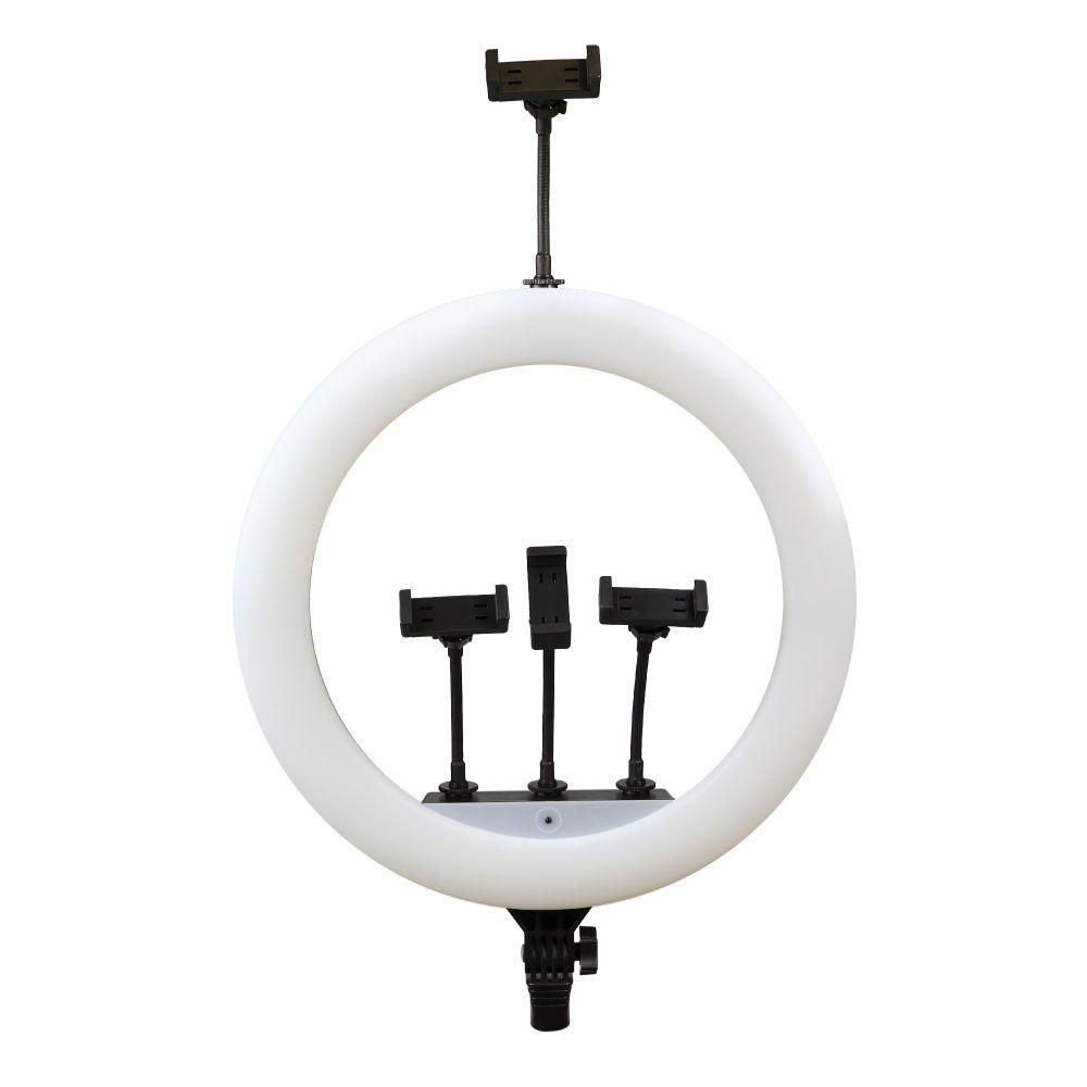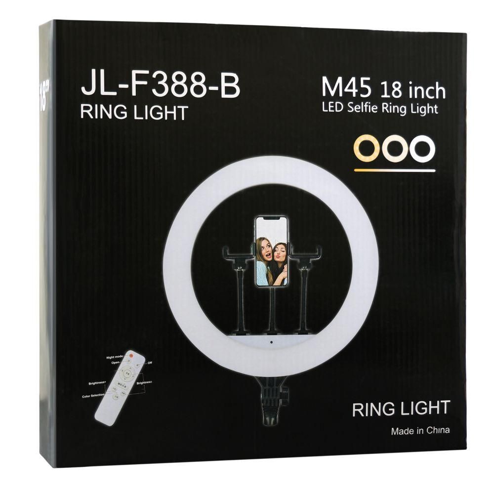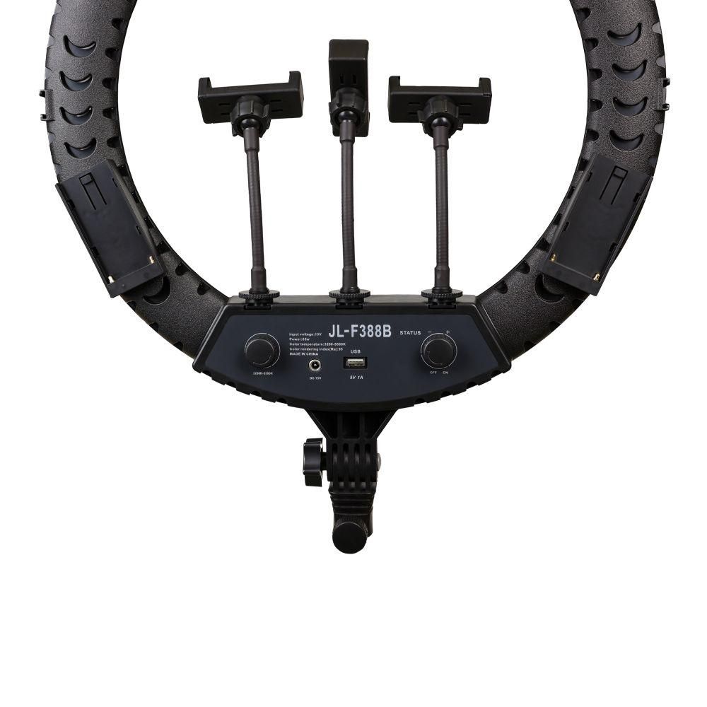 Кольцевая лампа JL-F388B – это функциональное и мощное осветительное устройство, которое станет надежным помощником в съемке качественного фото- и видеоконтента. Благодаря гибкой настройке и равномерному свету, она поможет создать профессиональное освещение в любых условиях. Особенности и преимущества кольцевой лампы JL-F388B: • Практичная форма кольца с удобно расположенными функциональными элементами. • Небольшой вес (около 1.4кг) и оптимальные размеры с внешним диаметром 45см. • Качественные электронные компоненты и корпус из прочной комбинации пластика и алюминиевого сплава • Надежная сборка и перфорация на задней панели для эффективного отвода тепла. • 3 винтовых крепления на верхней панели блока управления для установки держателей для смартфонов. • Винтовое крепление с фиксатором и шарнирным соединением для установки на штатив и настройки угла наклона. • Разъем DC для подключения к источнику питания и 2 слота для съемных батарей для обеспечения автономной работы. • Разъем USB с напряжением на выходе 5V при силе тока 1A для зарядки смартфона во время съемки. • Удобные регуляторы для бесступенчатой настройки яркости и цветовой температуры в диапазоне 3200-5500K. • Современные светодиоды с увеличенным ресурсом работы и общей мощностью 65W. • Приятный для глаз свет с незаметным мерцанием и высокий уровень цветопередачи (95Ra). • Комплектуется сумкой для удобной переноски, пультом ДУ, тремя держателями для смартфонов и сетевым блоком питания. Кольцевая лампа JL-F388B станет незаменимым помощником для фотографов, видеоблогеров, визажистов и всех, кому необходимо профессиональное освещение. Она не только обеспечит качественное освещение для работы и творчества, но и станет стильным дополнением интерьера.