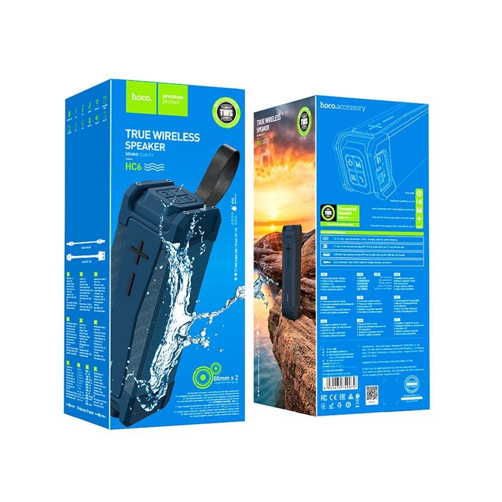 Портативная колонка Hoco HC6 – это стильное и многофункциональное аудиоустройство, разработанное для тех, кто ценит высокое качество звука и мобильность. Баланс между элегантным дизайном, технологичностью и простотой использования делает её идеальным выбором как для домашних развлечений, так и для активного отдыха на природе. Особенности и преимущества портативной колонки Hoco HC6: • Оригинальный дизайн со строгими линиями и стильными, практичными деталями. • Компактные размеры (260x88x88мм), небольшой вес (775г) и ремешок для удобной транспортировки. • Корпус из прочного ABS пластика, защищённый от воды по стандарту IPX5. • Износостойкая плетёная отделка и усиленные торцы. • Крупные кнопки для регулировки громкости и защищённые заглушкой интерфейсы. • Два больших динамика диаметром 66мм и общей мощностью 10W – воспроизводят чистый, насыщенный и громкий звук в широком диапазоне частот. • Модуль Bluetooth V5.0 (чип Bluetrum) для стабильного беспроводного соединения со смартфоном или планшетом. • Слот TF и разъём USB для воспроизведения музыкальных треков с карты памяти и флеш-накопителя. • Поддержка проводного подключения через стандартный разъём AUX. • FM-приёмник для использования без привязки к носителям информации и внешним источникам звука. • Качественный микрофон для удобного приёма и совершения звонков через смартфон. • Аккумулятор ёмкостью 4000mAh – 6 часов работы в активном режиме. • Разъём Micro-USB для зарядки. Время зарядки: около 5 часов. Колонка Hoco HC6 позволит наслаждаться музыкой в любом месте и в любое время. Функциональность и надёжность делают её незаменимой частью досуга, будь то прогулка, пикник или вечеринка.