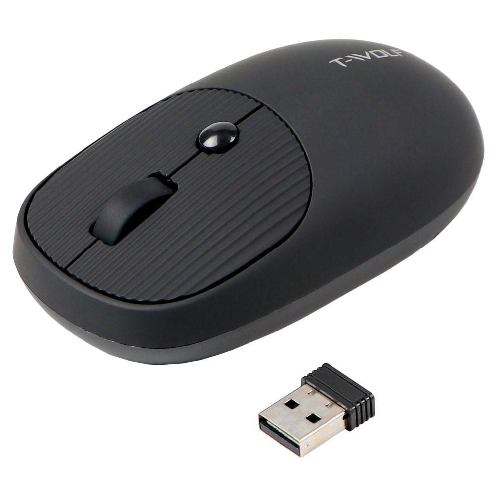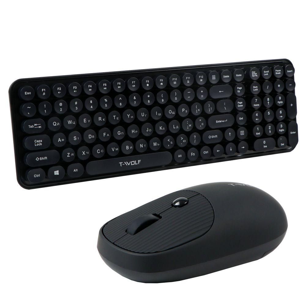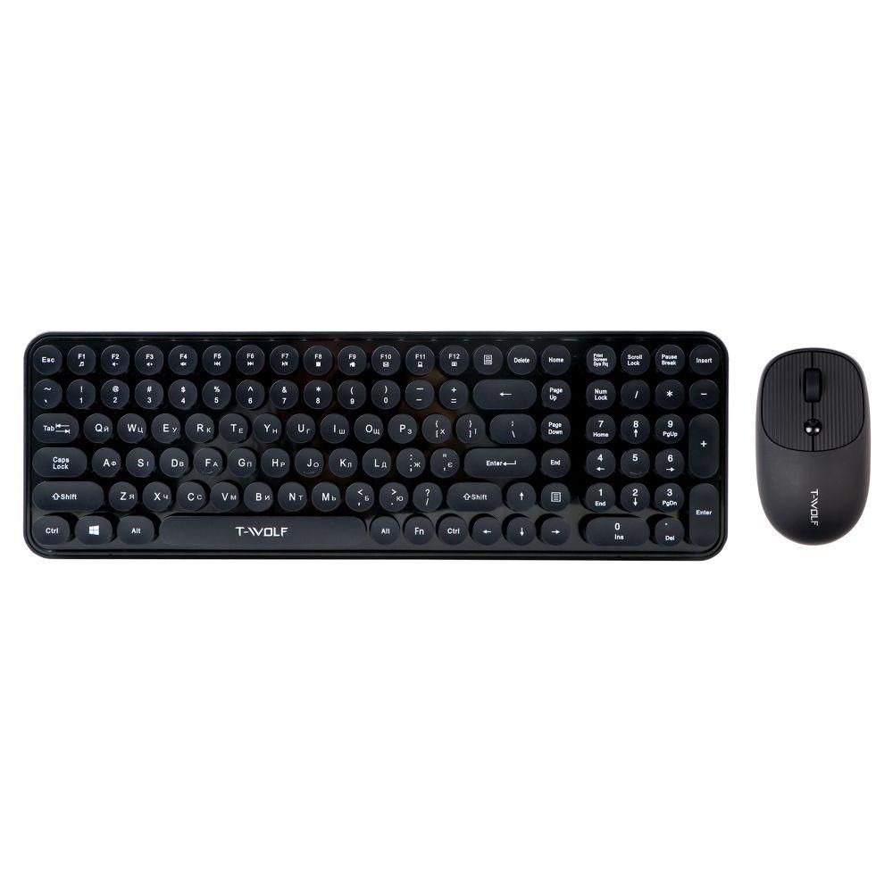 Беспроводная клавиатура и мышь TWolf TF350 Black – это идеальный выбор для тех, кто ценит комфорт, стиль и надежность в работе с компьютерной техникой. Этот комплект станет отличным дополнением к настольному ПК и может использоваться как дома, так и в офисе. Преимущества и особенности клавиатуры: • Оригинальный ретро-панк стиль – классический черный цвет и круглые плавающие клавиши, как у раритетной печатной машинки. • 105 клавиш и компактные размеры с небольшой толщиной (400x129x34мм). • Практичная форма со скругленными углами и ребрами. • Корпус из прочного ABS пластика и надежная сборка с защитой от воды. • Мембрана из упругого полимерного материала и высокий профиль клавиш, что создает ощущение тактильного отклика механических переключателей. • Противоскользящие накладки на нижней панели. • Кейкапы с приятной на ощупь поверхностью и качественно нанесенными символами. • 3 LED индикатора для контроля состояния и основных функций. • Интеллектуальная система энергосбережения и длительное время работы от одной сменной батарейки стандарта AAA. Преимущества и особенности мыши: • Стильный дизайн с оригинальными ребристыми панелями основных кнопок. • Компактные размеры (103x60x35мм) и сбалансированный, небольшой вес. • Эргономичная симметричная форма – удобный хват любой рукой. • Надежный корпус из прочного пластика с приятной на ощупь матовой поверхностью, которая предотвращает скольжение пальцев. • 4 кнопки: колесо прокрутки, 2 стандартные кнопки и кнопка смены DPI. • Современный оптический сенсор с разрешением 800, 1200 и 1600DPI. • Интеллектуальная система энергосбережения и длительное время работы от одной сменной батарейки стандарта AA. Стабильное беспроводное соединение устройств с компьютером осуществляется на частоте 2.4GHz в радиусе до 10м с помощью общего USB адаптера. TWolf TF350 Black — это практичное и эстетичное решение для беспроводной работы с максимальным комфортом.