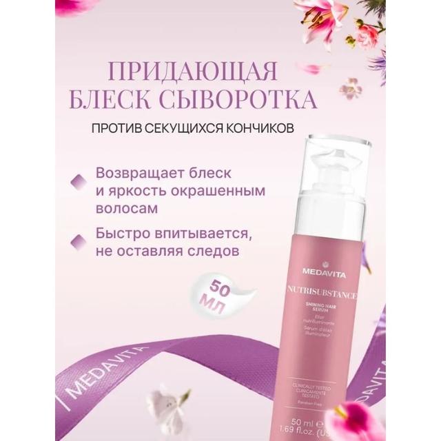 Medavita Nutrisubstance Shining Hair Serum — несмываемый питательный эликсир для сухих, поврежденных и пористых волос; быстро впитывается, создавая защитный слой для интенсивного увлажнения и восстановления структуры, подходит для всех типов, включая ломкие и тонкие, обеспечивает сияние, мягкость и защиту от внешних факторов без парабенов и глютена.