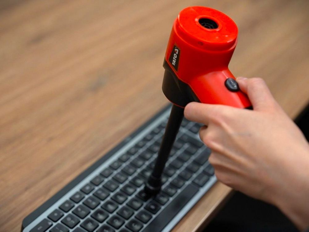 Он позволяет легко очищать труднодоступные углы, клавиатуры или салоны автомобилей, а также надувать кемпинговые матрасы или мячи с помощью дополнительной насадки.
