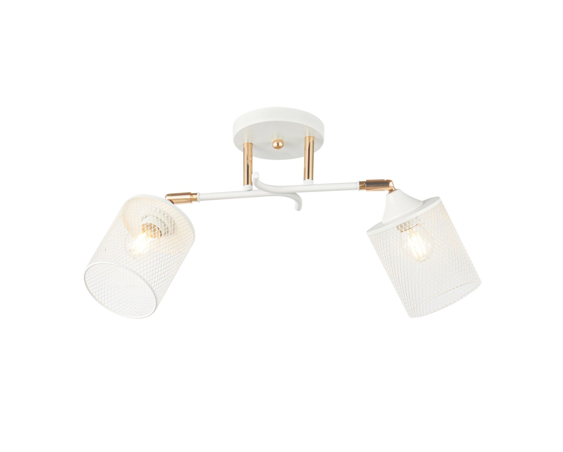 Декоративная люстра V 6322-2 WH+FG сочетает в себе современный дизайн с практичностью. Модель оснащена двумя плафонами с цоколем E27, выполненными в виде металлических каркасных абажуров, которые создают декоративный световой узор и придают интерьеру фактурность и элегантную геометрию.