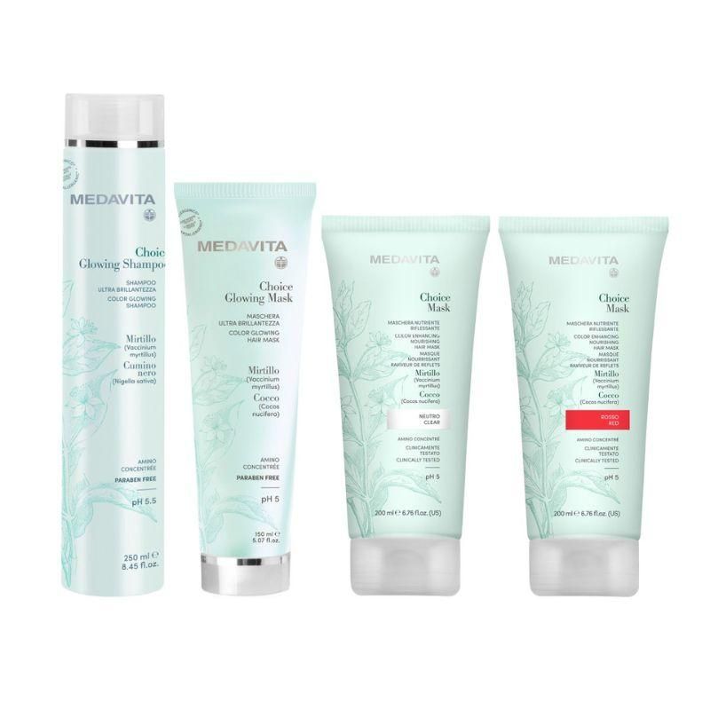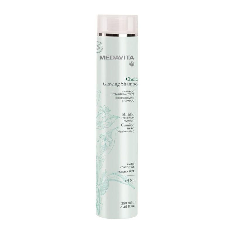 Medavita Choice Glowing Shampoo — антиоксидантный шампунь для окрашенных, осветленных и натуральных волос, обеспечивающий мягкое очищение с pH 5.5 без вымывания пигмента; проникает в структуру для питания и защиты цвета, подходит для всех типов, включая сухие и ослабленные, придает зеркальный блеск и эластичность без парабенов и сульфатов.