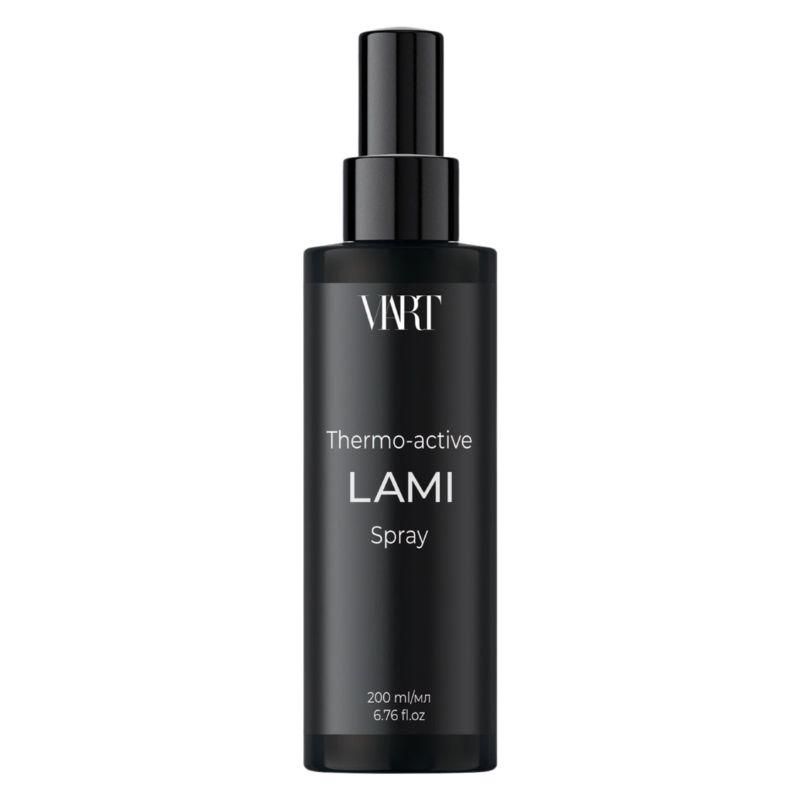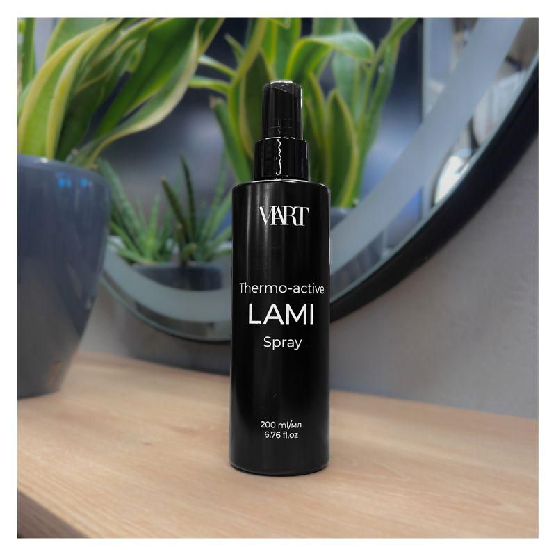 Viart Thermo-Active Lami Spray — ламелярный термоактивный спрей, создающий защитную пленку на поверхности волос от высоких температур (до 230°C); подходит для всех типов, включая поврежденные и сухие, усиливает восстановление, блеск и фиксацию, предотвращает ломкость и вред от стайлинговых инструментов, может использоваться самостоятельно или после ламеллярной воды.