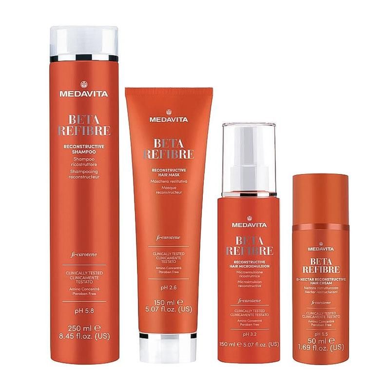Medavita Beta Refibre Reconstructive Hair Microemulsion – спрей для питания, увлажнения и эффективной регенерации волос. Средство имеет мелкую дисперсию, что позволяет быстро придавать волосам жизненную силу, блеск и мягкость. Продукт содержит бета-каротин, обладающий антиоксидантным действием, и комплекс аминокислот для регенерации поврежденных участков.