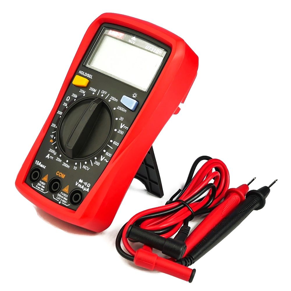 - UT33D+ измеряет постоянное и переменное напряжение до 600 В, постоянный ток до 10 А и сопротивление до 200 МОм, что позволяет использовать его для ремонта бытовой техники, электроники, проверки электросети и автомобильной электрики.