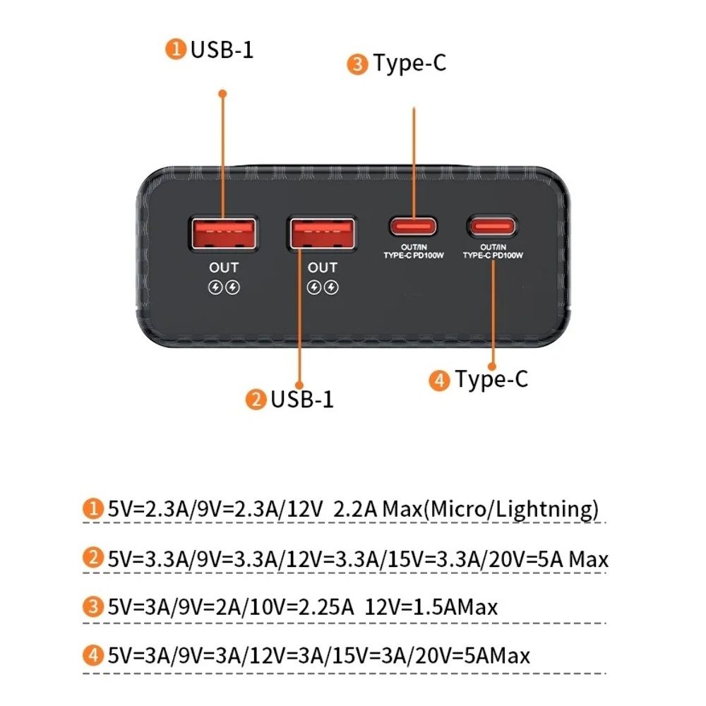 - 2 × Type-C (вход/выход, поддержка PD, до 100 Вт)