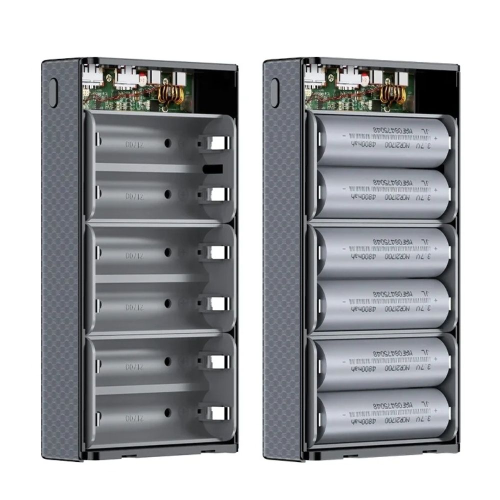 Multi-powerbank Q6 — это готовый корпус с платой управления и разъемами, предназначенный для самостоятельной сборки мощного повербанка на элементах 21700. Устанавливая до 6 аккумуляторов, вы получаете высокопроизводительный внешний источник питания с поддержкой быстрой зарядки PD до 100 Вт, цифровым дисплеем и четырьмя портами для одновременного питания нескольких устройств.