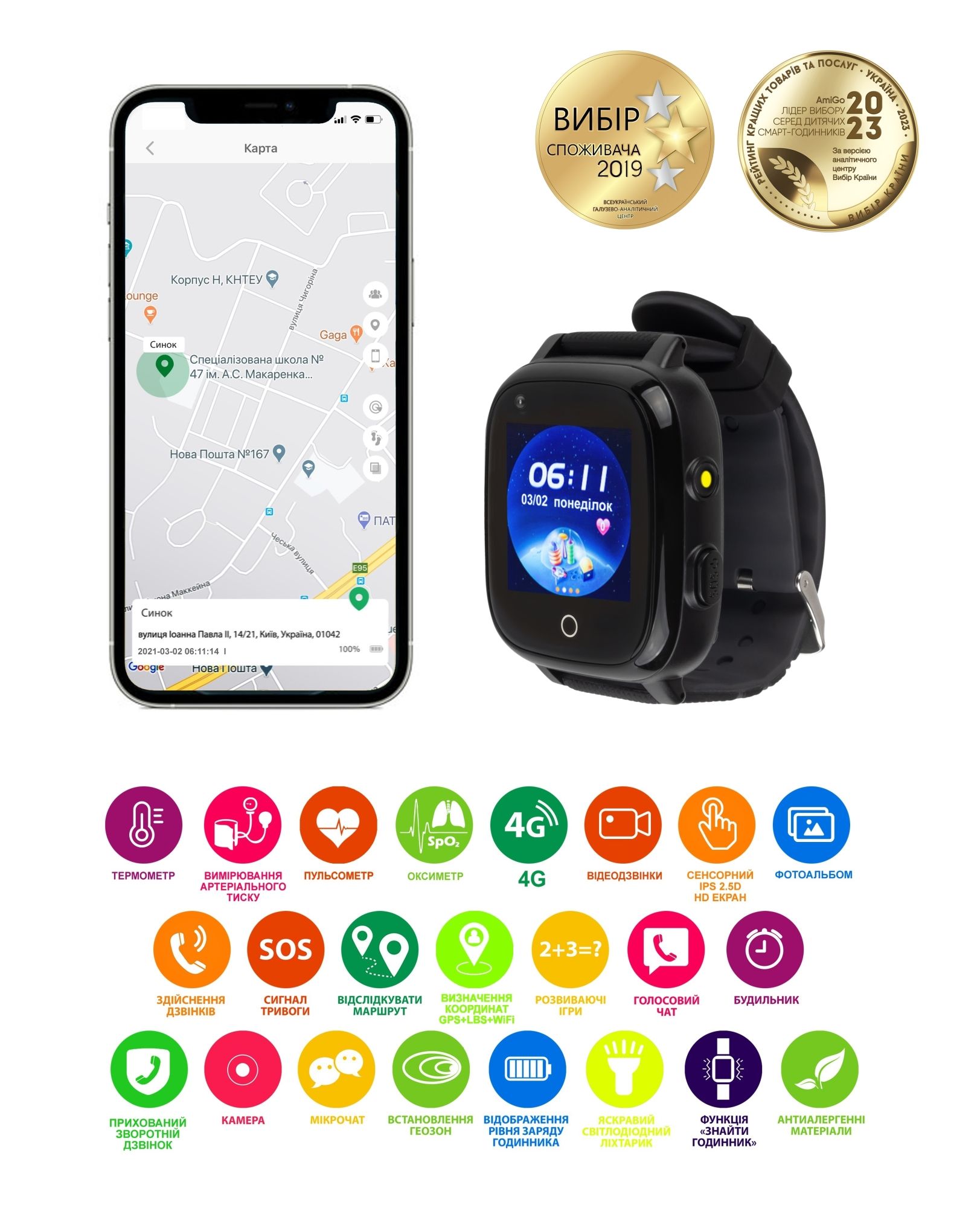 Детские смарт-часы AmiGo GO005 Thermometer 4G WIFI Black UA UCRF