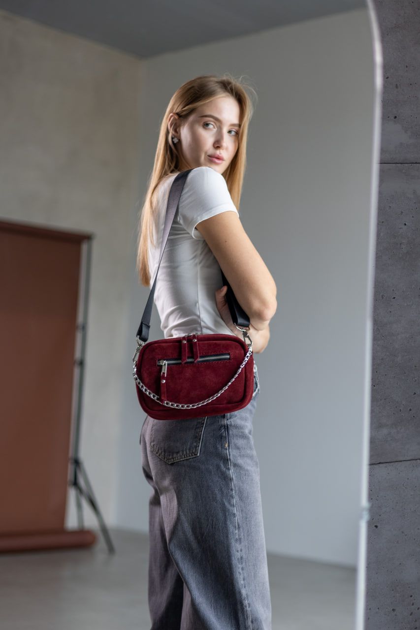 Жіноча сумка крос-боді з замші в кольорі бургунді — витончений аксесуар, який підкреслить ваш бездоганний смак і додасть образу нотку розкоші. М’яка, приємна на дотик натуральна замша або високоякісна штучна замша преміум-класу створює глибокий, насичений відтінок бургунді, який красиво переливається при різному освітленні.