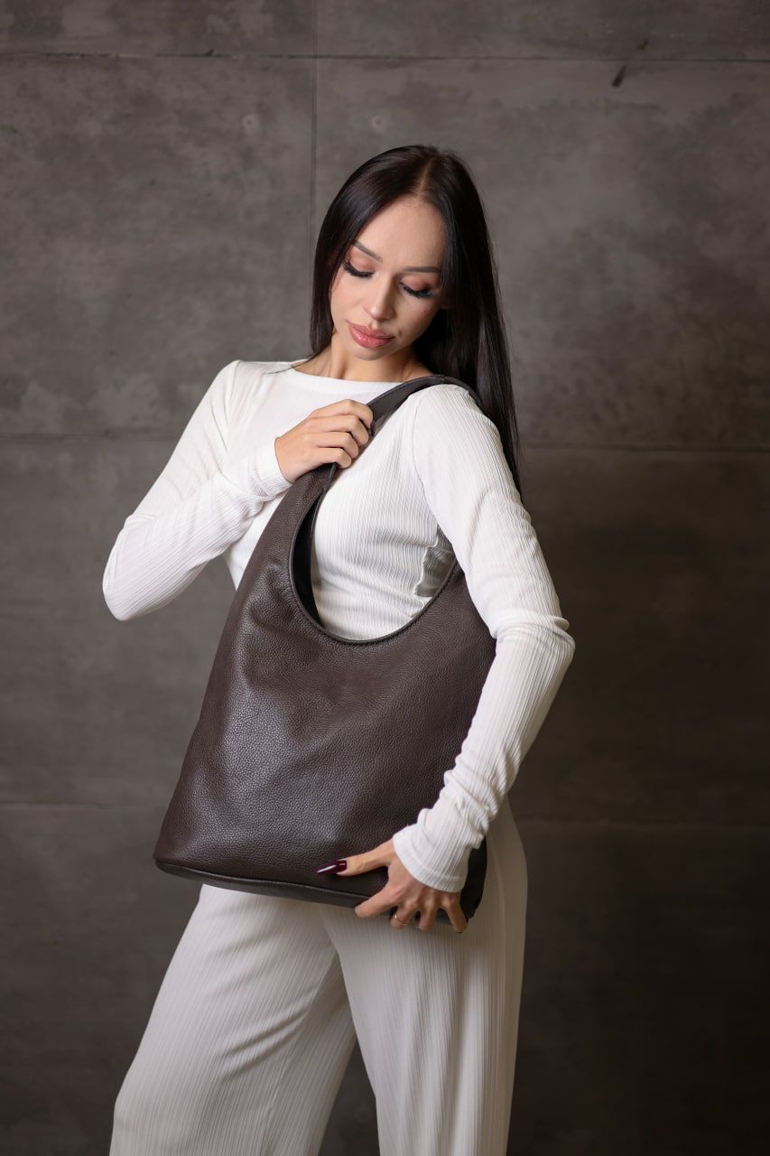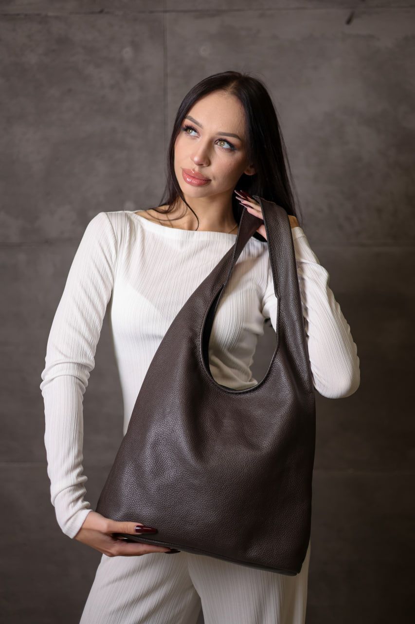 Модель має одну широку ручку, що дозволяє комфортно носити її на плечі або в руці. Завдяки м’якій текстурі шкіри та зручному розміру сумка легко вміщує всі необхідні речі на день — документи, косметичку, аксесуари. Шоколадний колір додає глибини образу, а якісна фурнітура й продуманий дизайн забезпечують довговічність і щоденний комфорт.