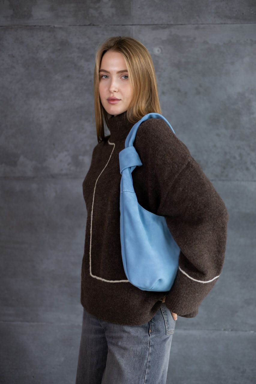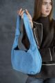 Cтильна, сучасна жіноча сумка з м’якої замші небесно-блакитного кольору. Вона має плавні лінії, м’яку форму та характерну деталь — ручку, зав’язану у вузол, що додає їй оригінальності та трендовості.