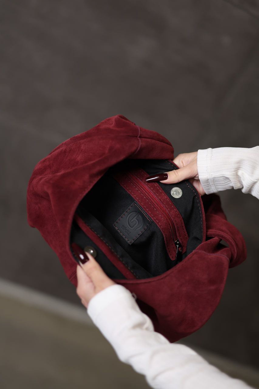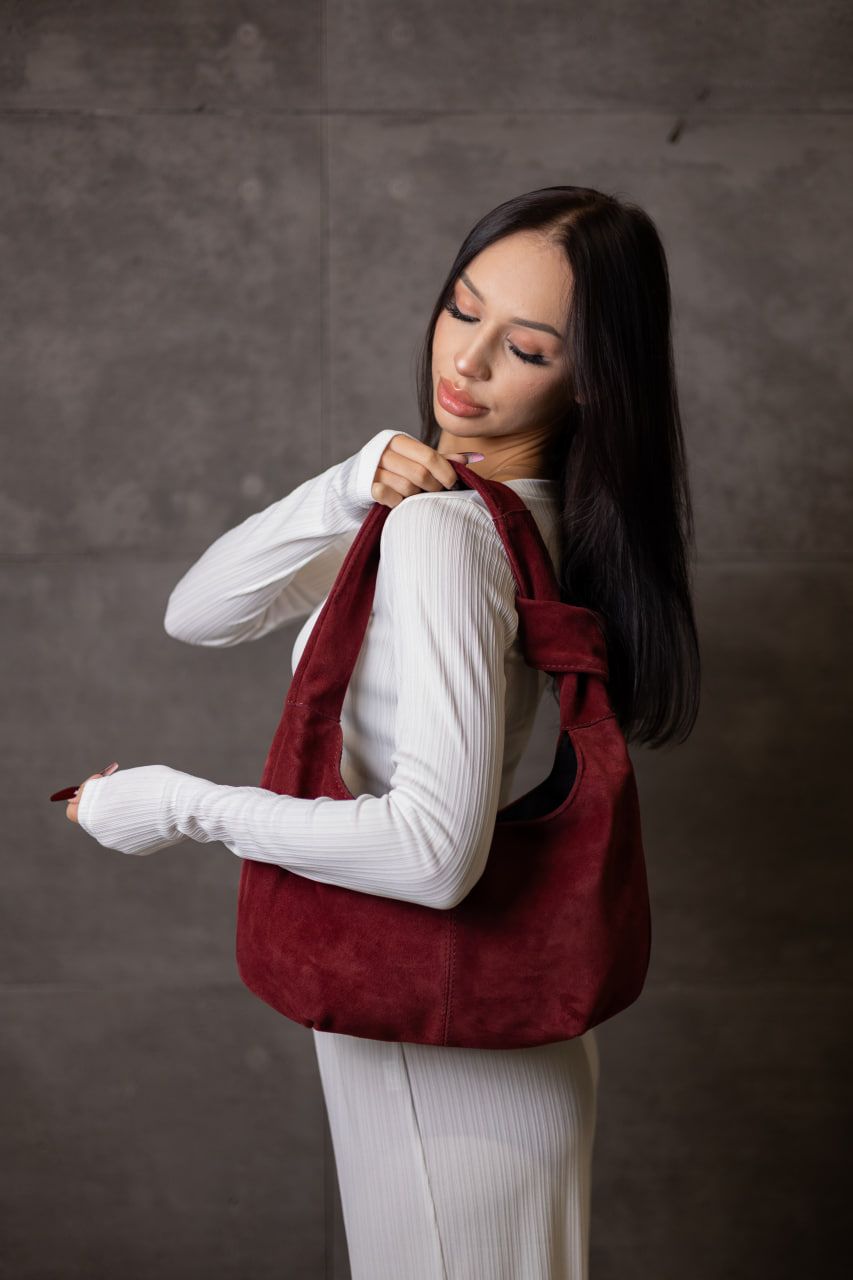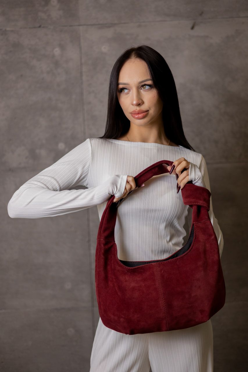 Це елегантний та стильний аксесуар для будь-якої модниці. Вона виготовлена з високоякісної замші, що надає їй розкішного вигляду, при цьому залишається м’якою на дотик і дуже приємною для використання. Колір бургунді — глибокий винно-червоний відтінок, який виглядає вишук.