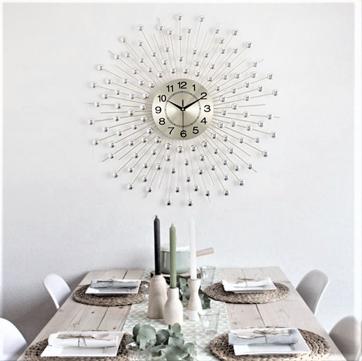 Очень красивые большие настенные часы, которые станут необычным украшением вашей комнаты. Бесшумный механизм позволяет разместить эти часы на стене в спальне. Благодаря эстетическому дизайну и благородно мерцающим стразам они будут одним из центральных элементов декора вашего дома.