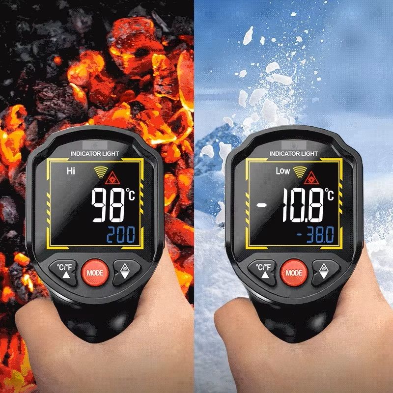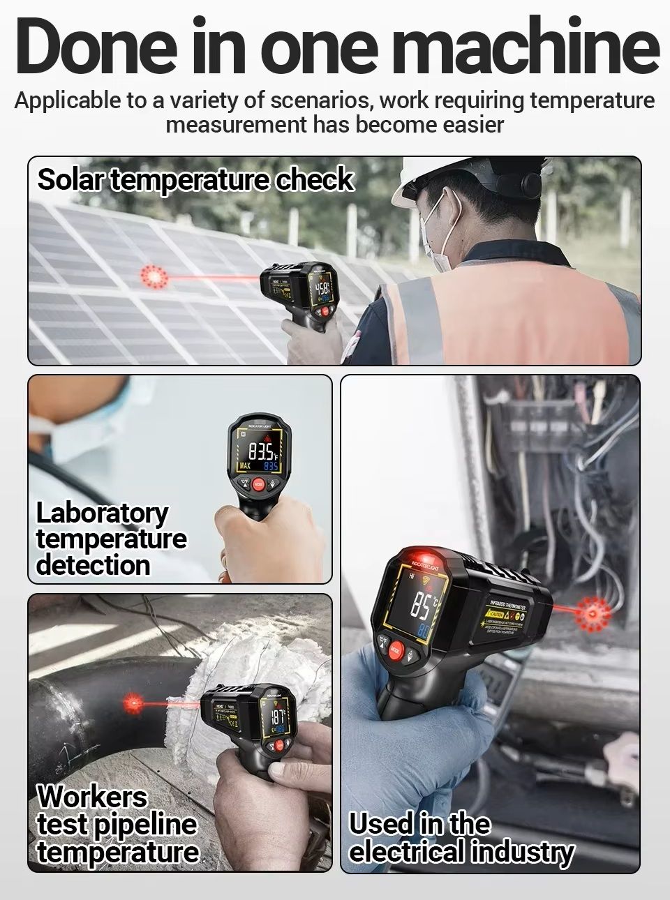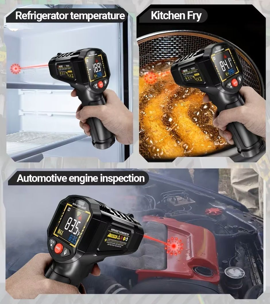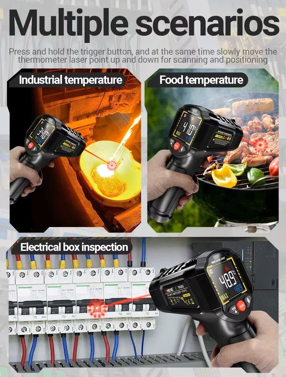 Этот профессиональный бесконтактный прибор предназначен для точного измерения температуры различных поверхностей в промышленном, техническом и бытовом применении: диагностика электрооборудования, проверка температуры двигателей, измерение температуры нагревательных элементов, пайки, оборудования на производстве, продуктов, жидкостей, холодильников, систем отопления и вентиляции.
