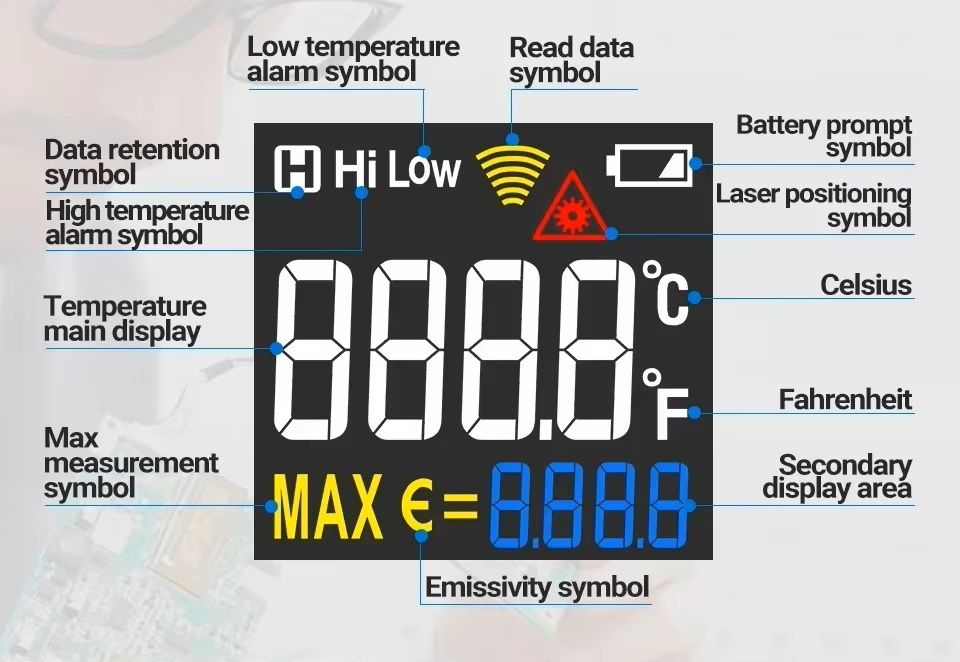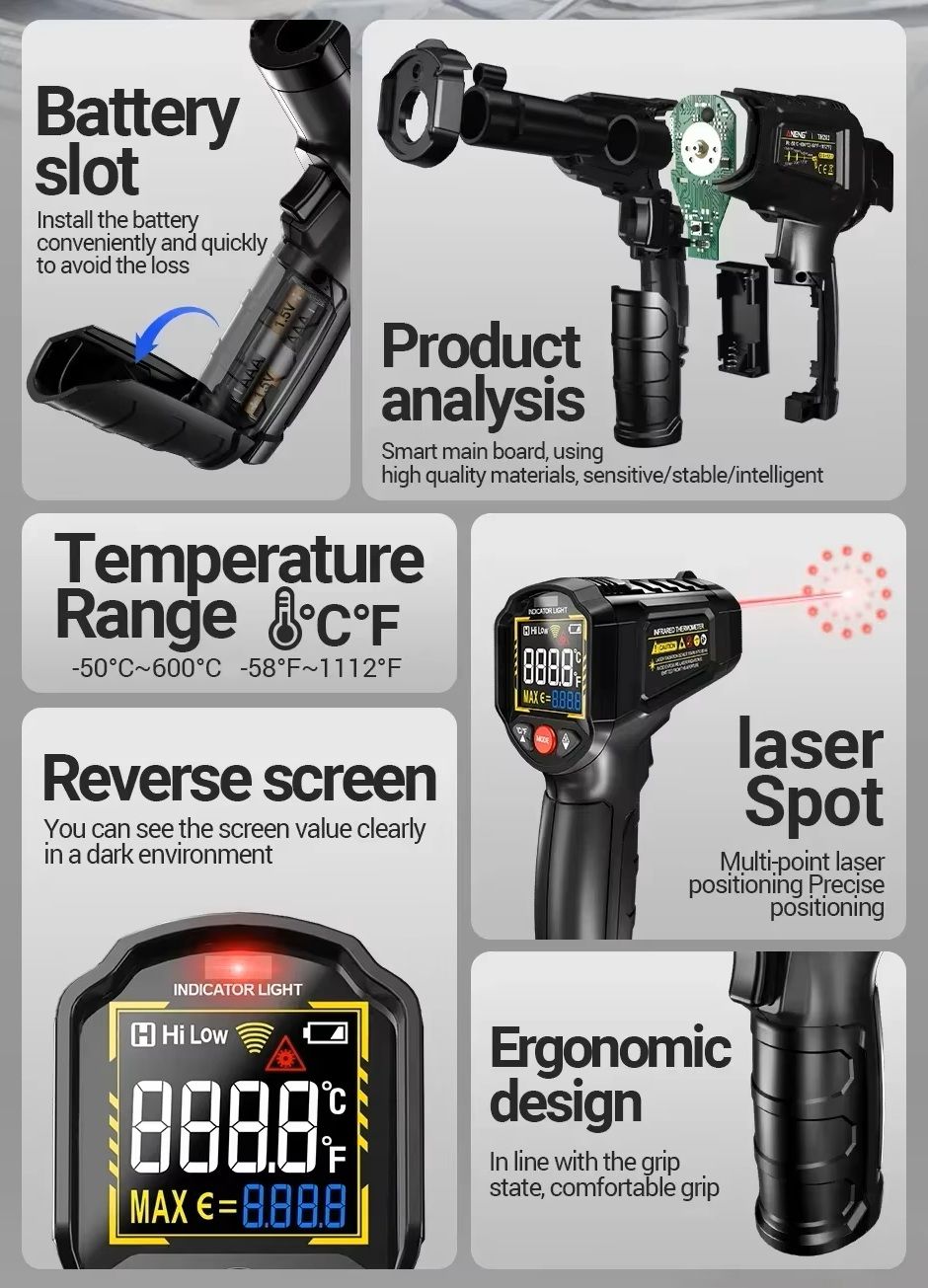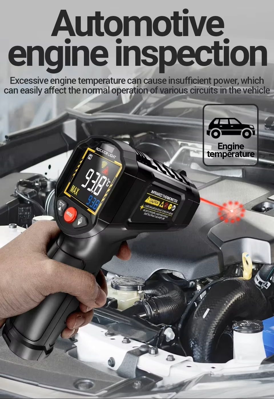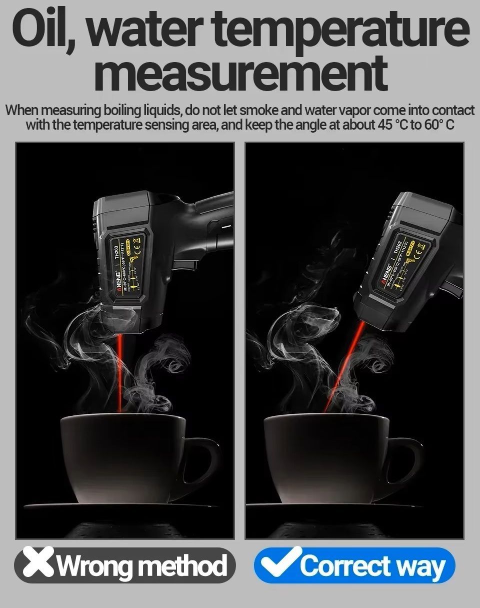 Этот профессиональный бесконтактный прибор предназначен для точного измерения температуры различных поверхностей в промышленном, техническом и бытовом применении: диагностика электрооборудования, проверка температуры двигателей, измерение температуры нагревательных элементов, пайки, оборудования на производстве, продуктов, жидкостей, холодильников, систем отопления и вентиляции.