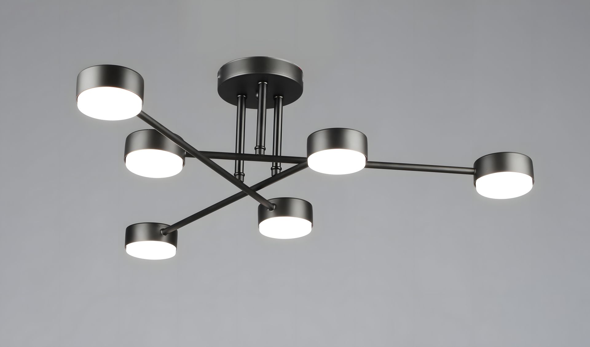 Представляем современную потолочную люстру VALESO N6716/6 — идеальное решение для тех, кто ценит лаконичный дизайн и мощное освещение. Люстра выполнена в глубоком черном цвете из прочного металла, что обеспечивает ее надежность и долговечность. Благодаря диаметру 750 мм, эта модель эффективно освещает просторные помещения, такие как гостиные, студии или офисные пространства.