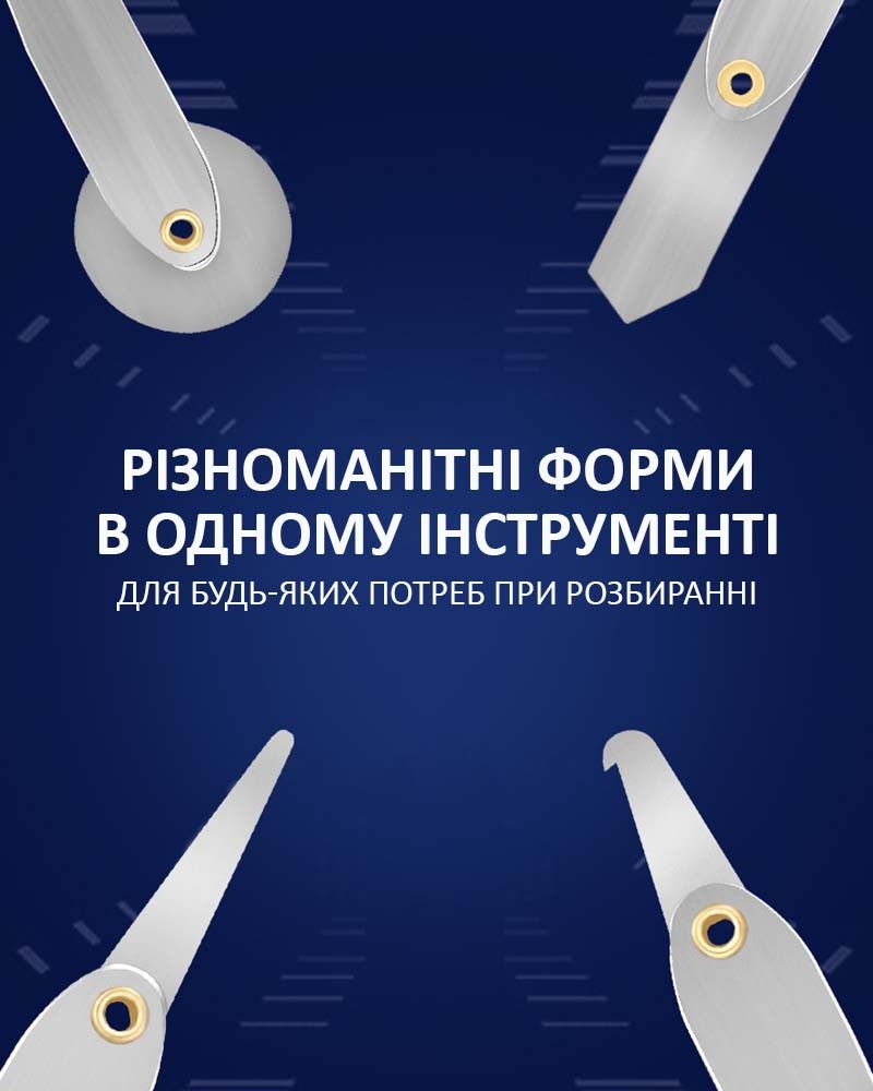 - В одном наборе сразу четыре различных формы лезвий: узкое острое, крючкообразное, широкое прямое и торцевое лезвие. Это позволяет подобрать оптимальный инструмент под любую задачу – от начального поддевания до полного отделения модуля.