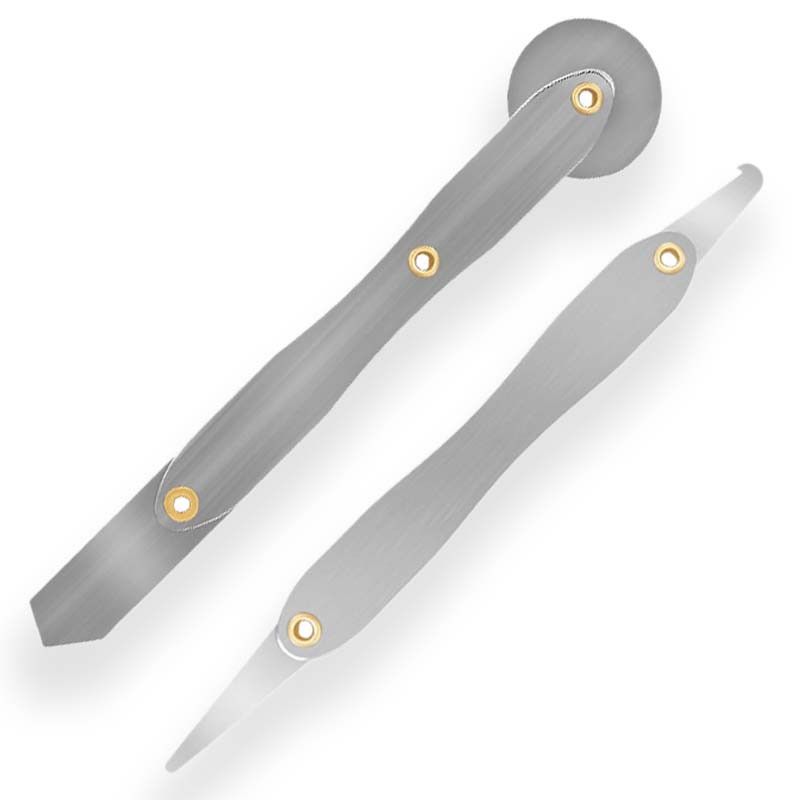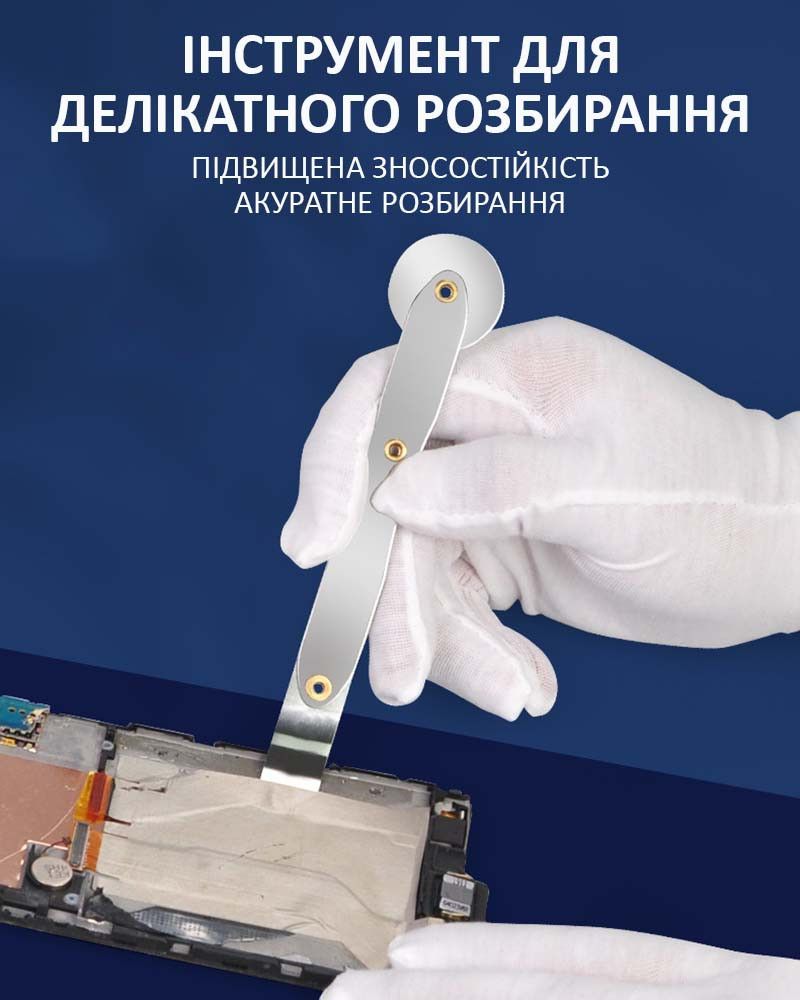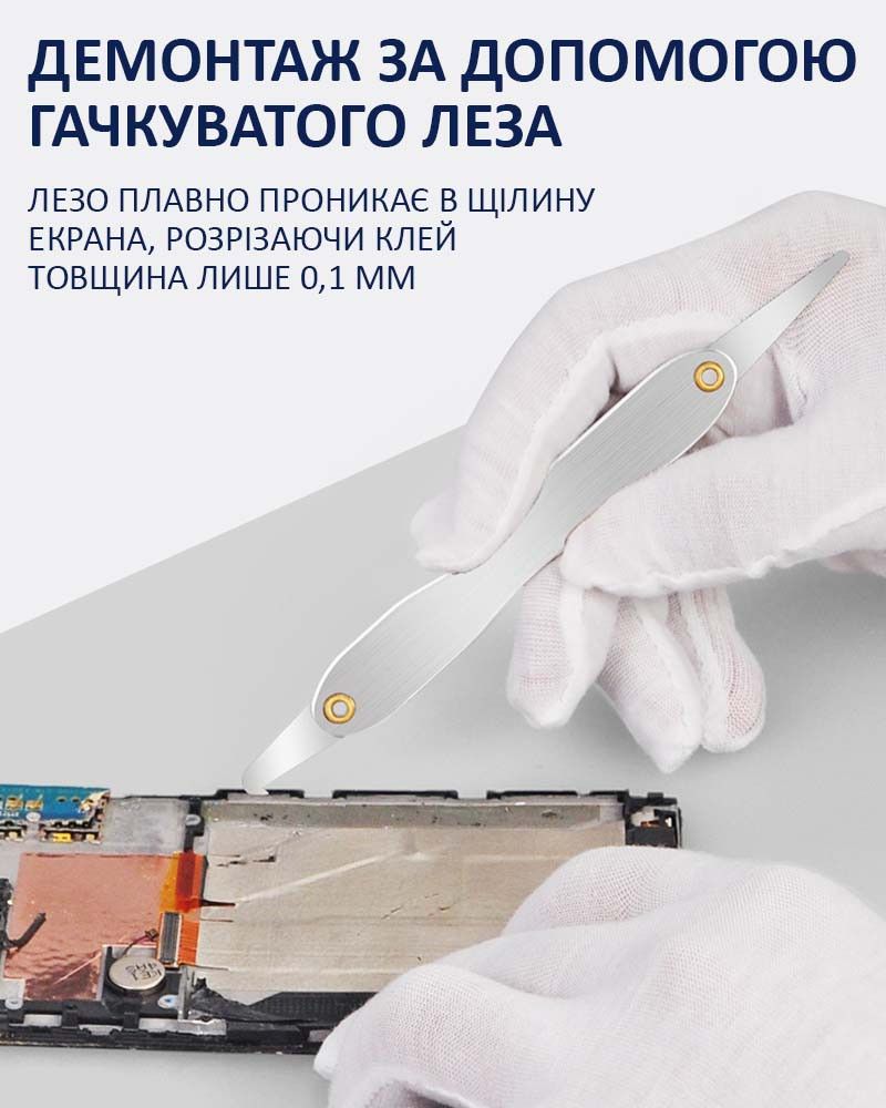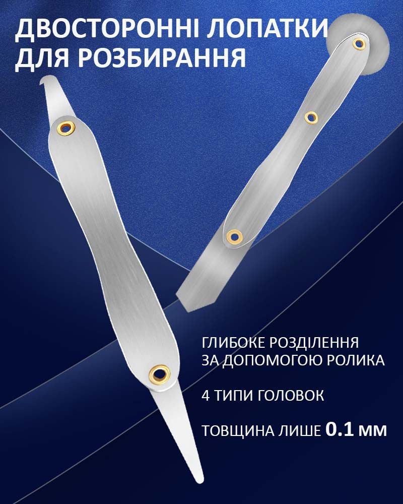 Это профессиональный инструмент для аккуратной разборки корпусов смартфонов, планшетов и другой портативной электроники. Две двусторонние металлические лопатки с разной формой лезвий и поворотным роликом позволяют безопасно разъединять склеенные элементы, не повреждая дисплей, рамку и крышку устройства. Толщина рабочих пластин всего 0,1 мм, поэтому они легко входят даже в очень узкие зазоры.