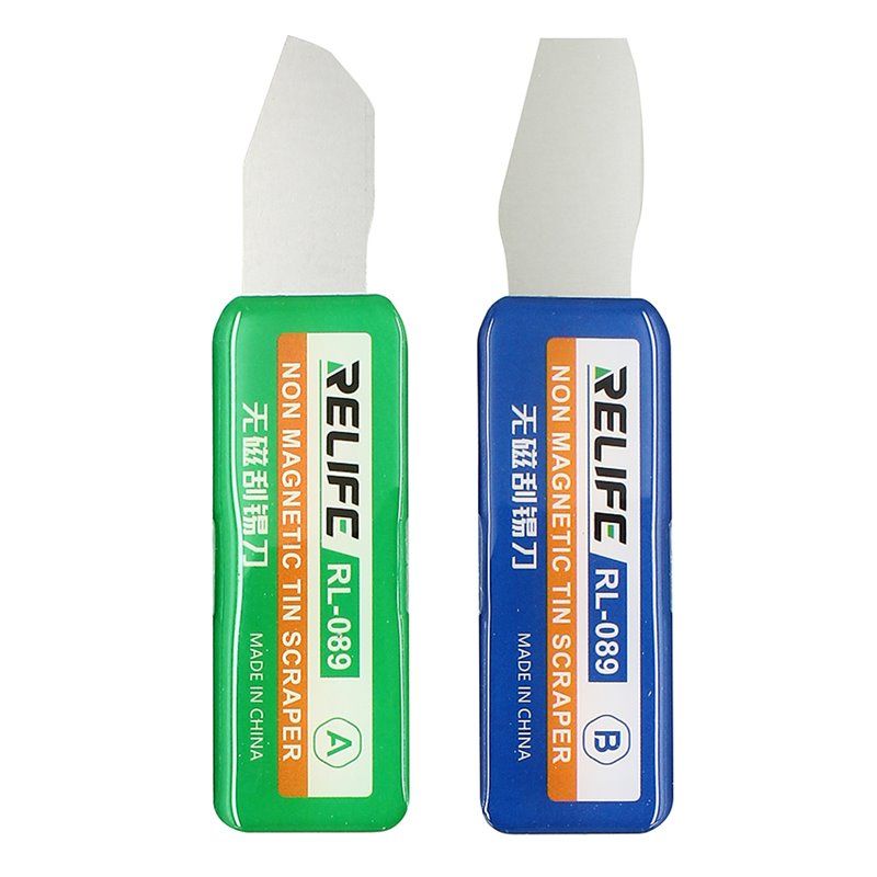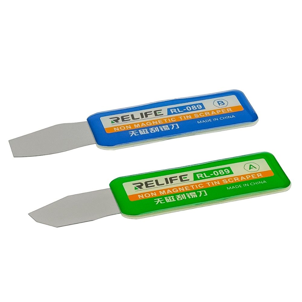Набор Relife RL-089 – это пара профессиональных немагнитных скребков-лопаток, разработанных для точной работы с материнскими платами, CPU и микросхемами, а также для аккуратного поддевания дисплеев и модулей. Две различные формы лезвий (A и B) позволяют выбирать оптимальный угол и площадь контакта при снятии припоя, клея или разделении склеенных деталей корпуса. Немагнитный сплав и тонкое, но прочное лезвие обеспечивают безопасную работу рядом с мелкими SMD-компонентами и контактными площадками.