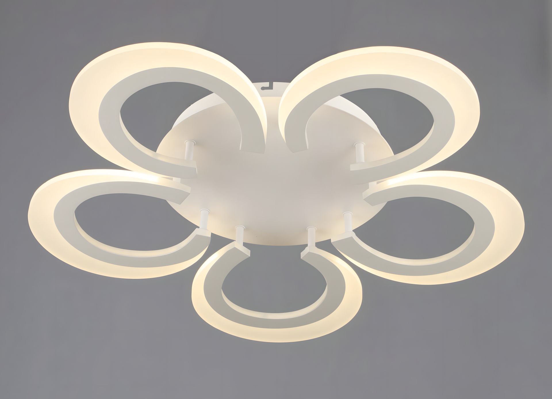 Люстра оснащена 5 встроенными LED-модулями мощностью 7W каждый, что дает общую мощность 35W. Общий световой поток 8750 люменов гарантирует яркое и комфортное освещение. Модель поддерживает функцию переключения цветовой температуры: 3000K (теплый свет) и 6500K (холодный свет), что позволяет адаптировать атмосферу в помещении. Размер изделия: диаметр 630 мм, высота 90 мм. Ее минимальная высота делает эту люстру идеальным выбором для помещений с низкими потолками.