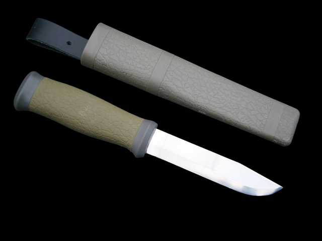Нож поставляется в прочном пластиковом кейсе оливкового цвета. В конструкцию чехла входит кожаная петля для крепления ножа на поясе и два дренажных отверстия в нижней части, которые позволяют стирать его и предотвращают скопление влаги внутри. Нож надежно и быстро фиксируется благодаря небольшой выемке внутри корпуса и специальному выступу. Крепление возможно как под левую, так и под правую руку.
