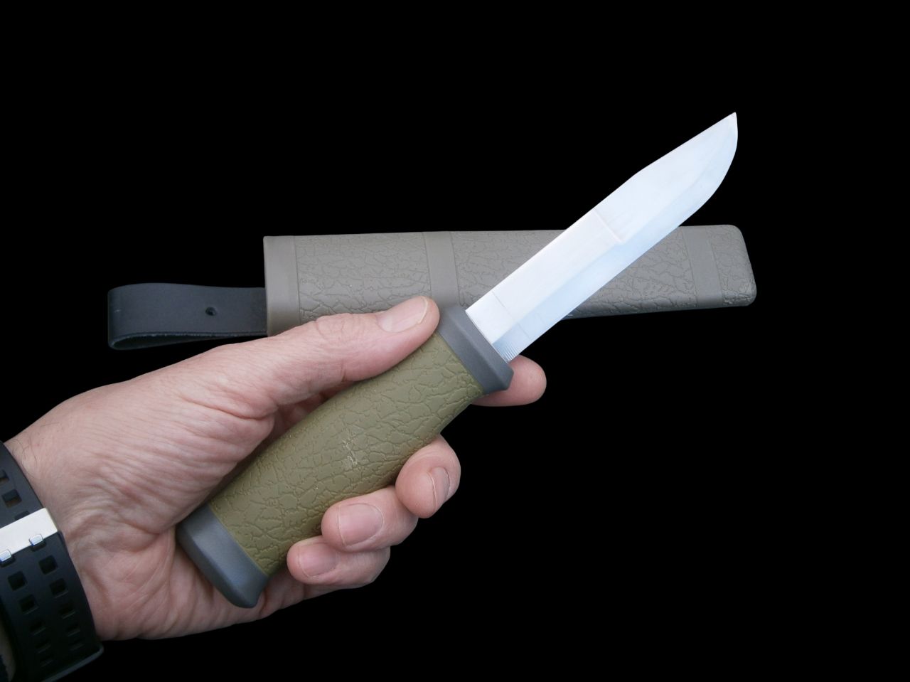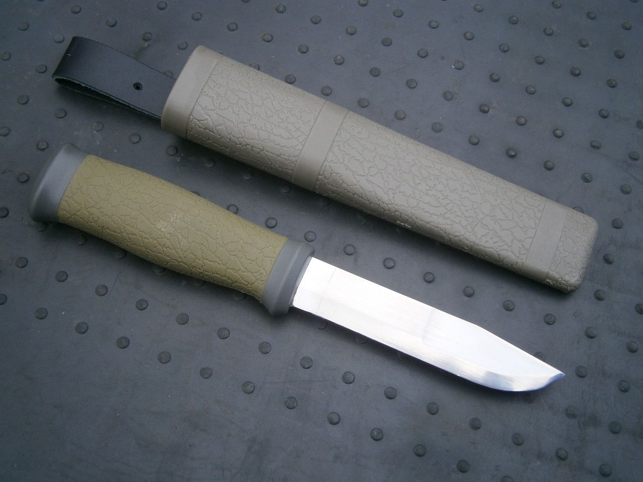 Нож поставляется в прочном пластиковом кейсе оливкового цвета. В конструкцию чехла входит кожаная петля для крепления ножа на поясе и два дренажных отверстия в нижней части, которые позволяют стирать его и предотвращают скопление влаги внутри. Нож надежно и быстро фиксируется благодаря небольшой выемке внутри корпуса и специальному выступу. Крепление возможно как под левую, так и под правую руку.