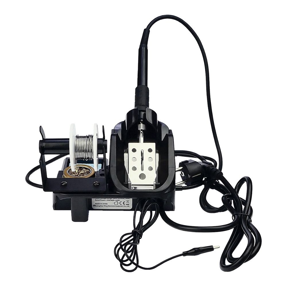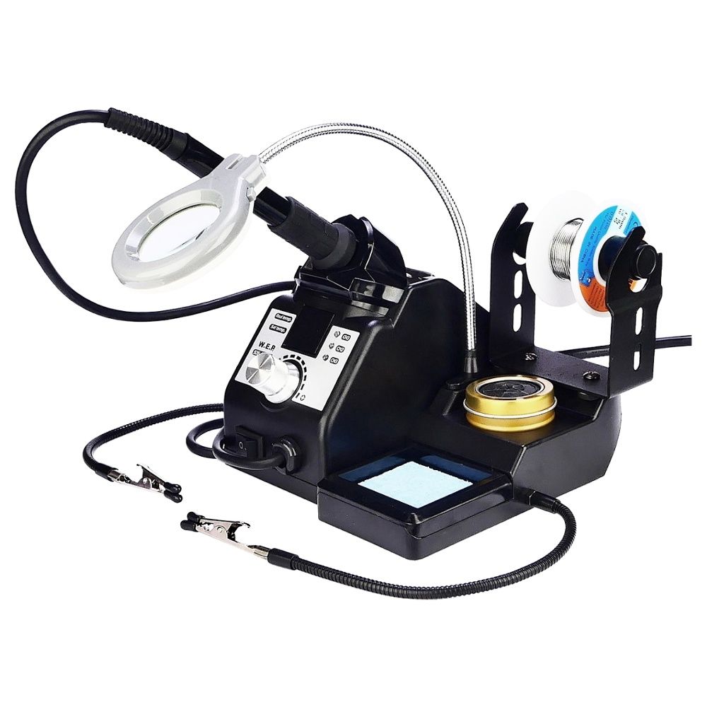 - Все необходимые элементы (подставка, очистители жала, держатель припоя, лупа) расположены на одной базе и не занимают лишнее место на столе.