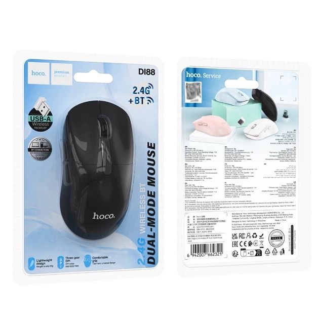 Беспроводная мышь Hoco DI88 – это компактная и стильная мышь с двумя режимами подключения, созданная для комфортной работы за ноутбуком, ПК, планшетом или смартфоном. Благодаря регулировке чувствительности и удобной форме она одинаково хорошо подходит для офиса, учёбы и дома.