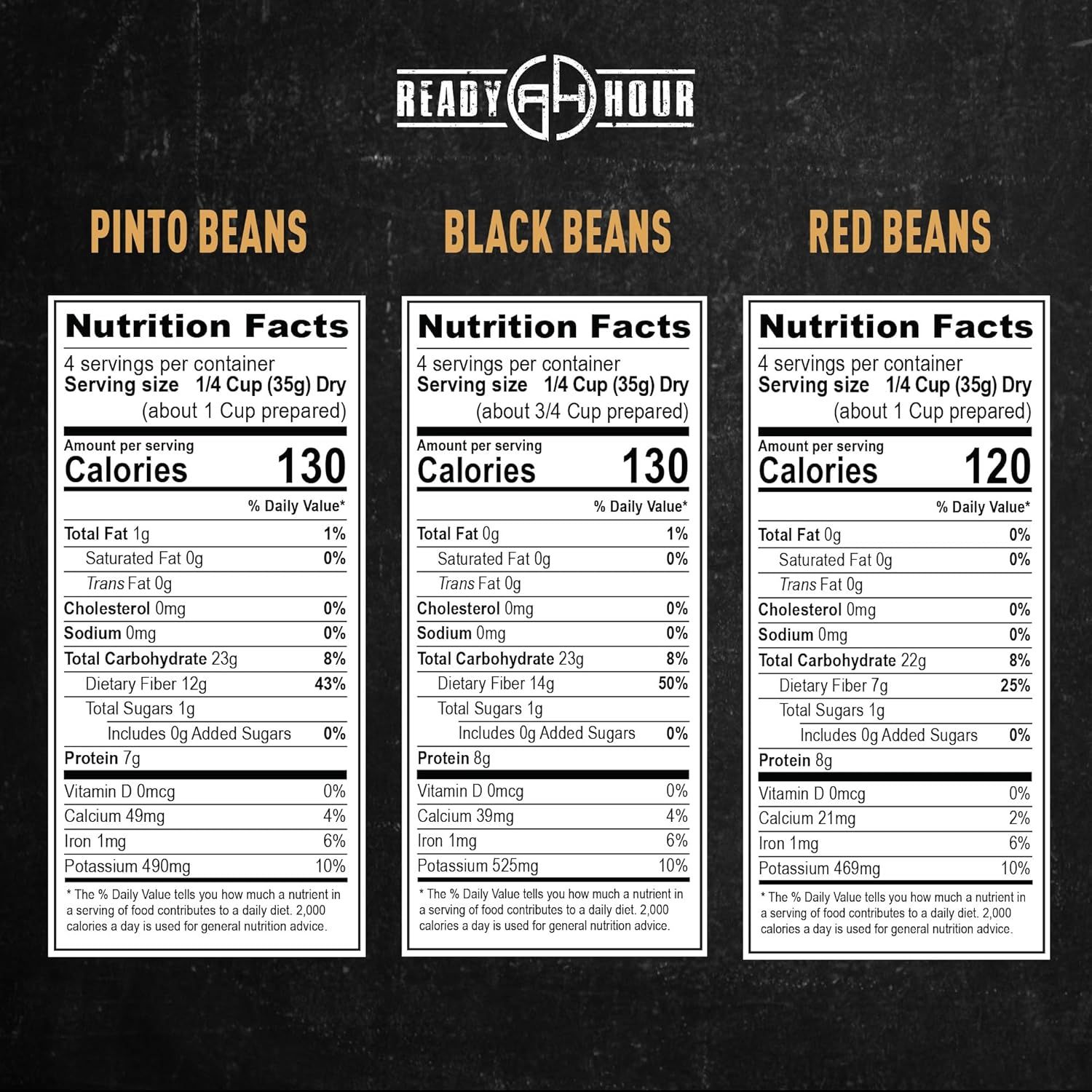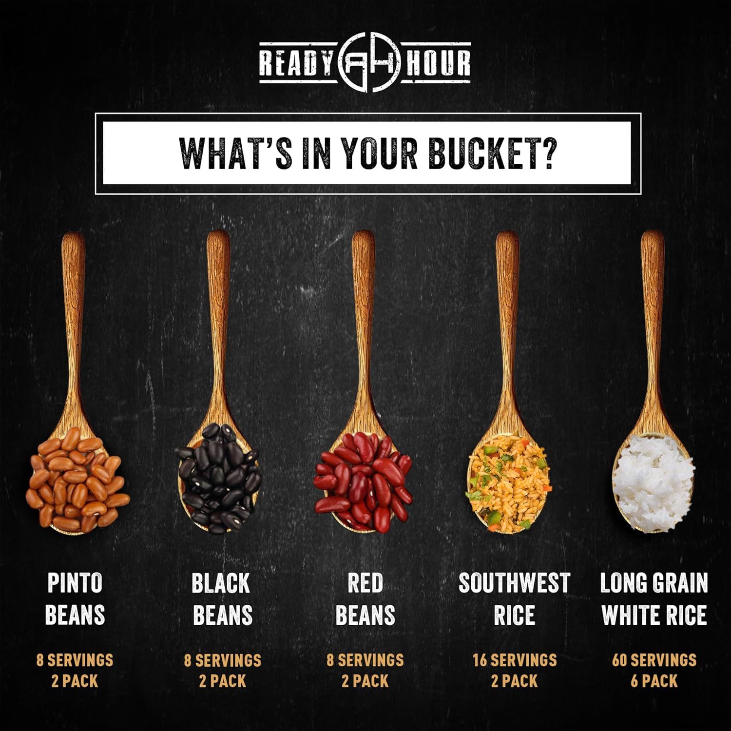 Набор сублимированной еды из 3х видов фасоли и 2х видов риса от американской компании Ready Hour содержит 100 порций (американского стандарта), из которых 24 порции фасоли и 76 порций риса общей калорийностью 16760 калорий. Он рассчитан на очень долгий срок хранения - до 25 лет без холодильника.