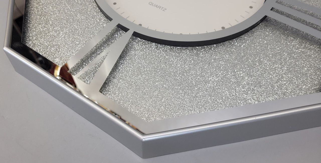 Высота: 48,2 см Ширина: 48,2 см Толщина: 4,3 см Вес: 1,740 кг Материал: стекло, пластик Внутри часов блестки. Механизм: кварцевое Питание: батарейка АА Гарантия: 12 месяцев