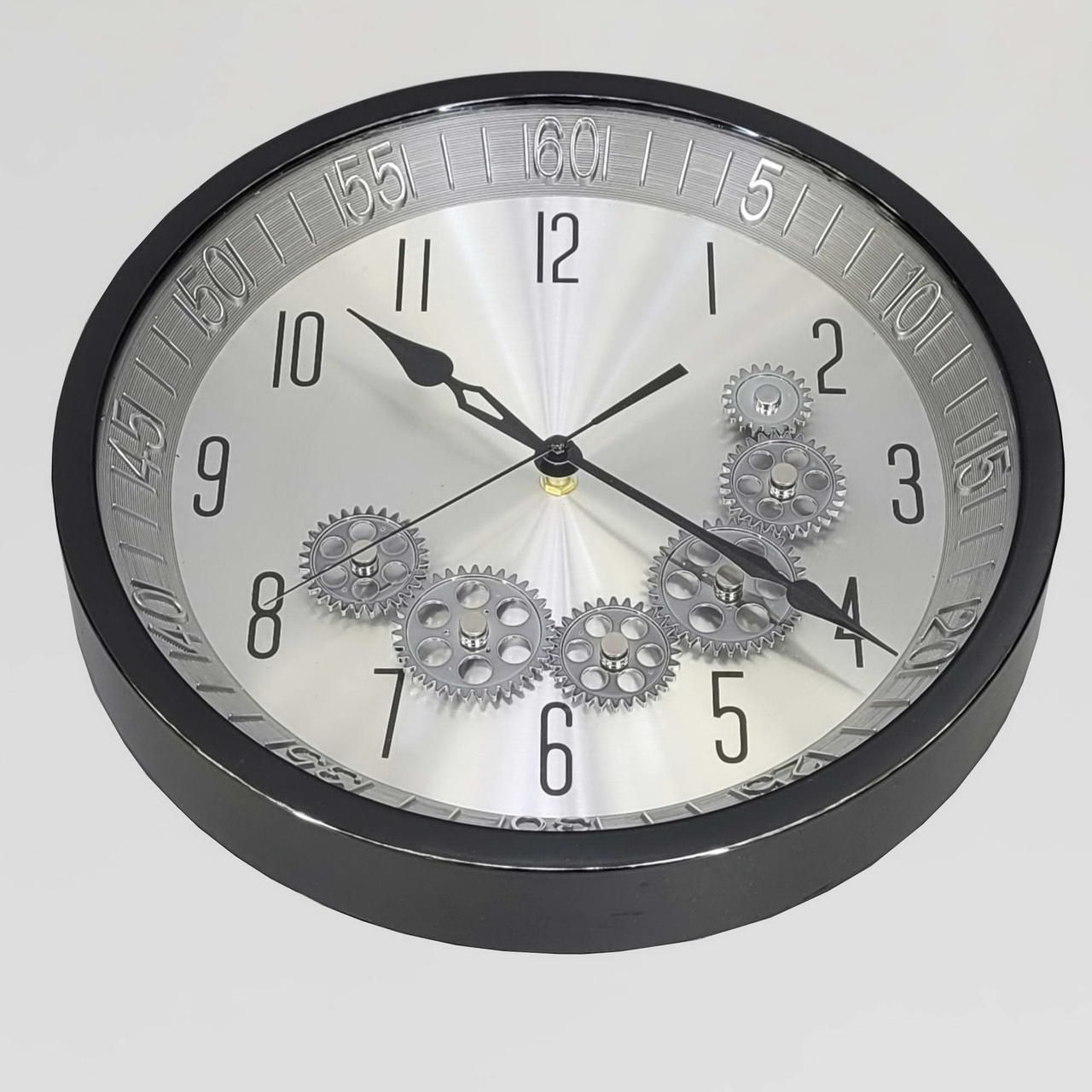 Диаметр: 35,2 см Толщина: 5,4 см Вес: 1,235 кг Материал: стекло, пластик Декоративные шестерни, самостоятельно вращающиеся через дополнительные батареи. Механизм: кварцевое Питание: батарейка АА Гарантия: 12 месяцев