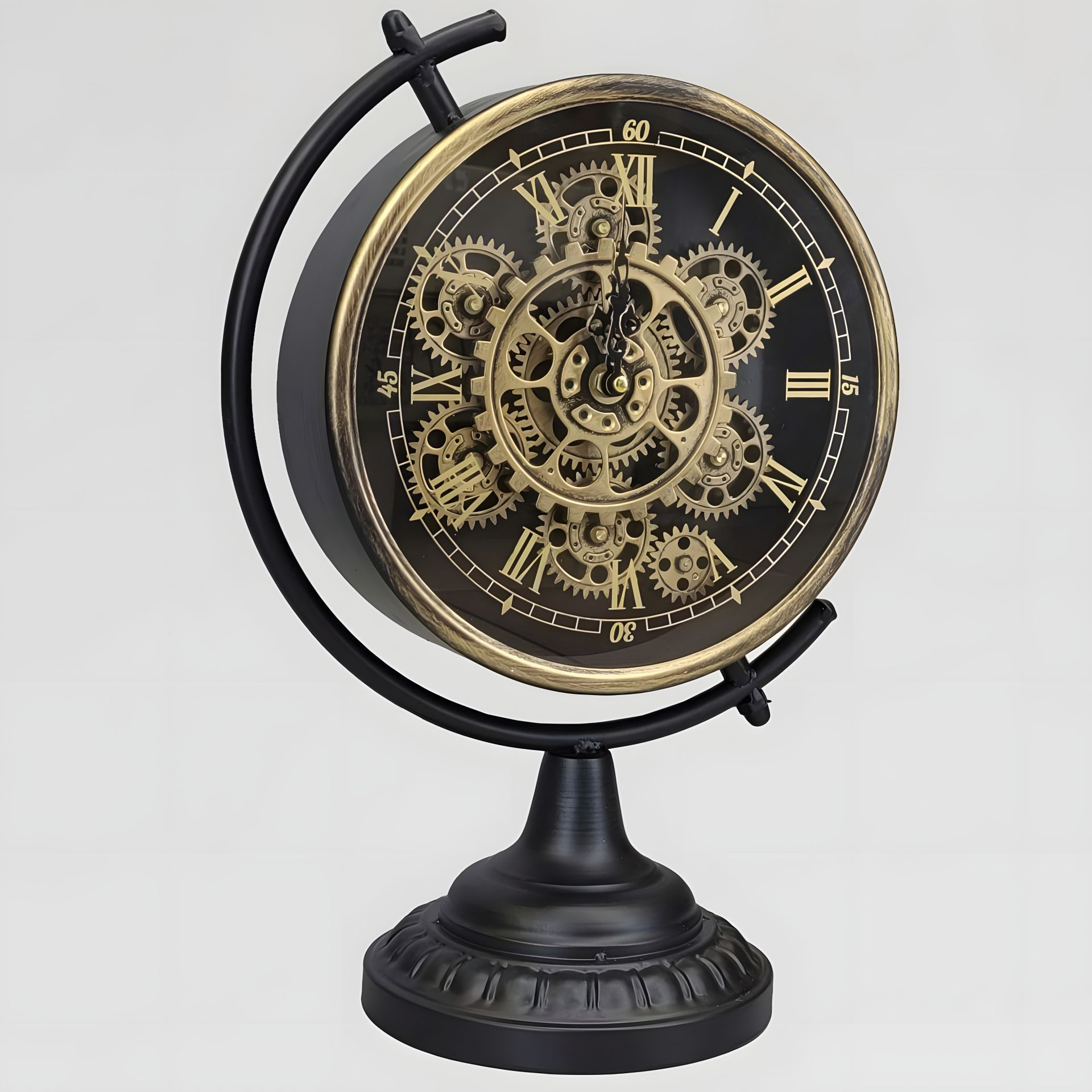 Высота: 43 см Ширина: 30 см Вес: 1,425 кг Материал: стекло, металл Декоративные шестерни, самостоятельно вращающиеся через дополнительные батареи. Механизм: кварцевое Питание: батарейка АА Гарантия: 12 месяцев