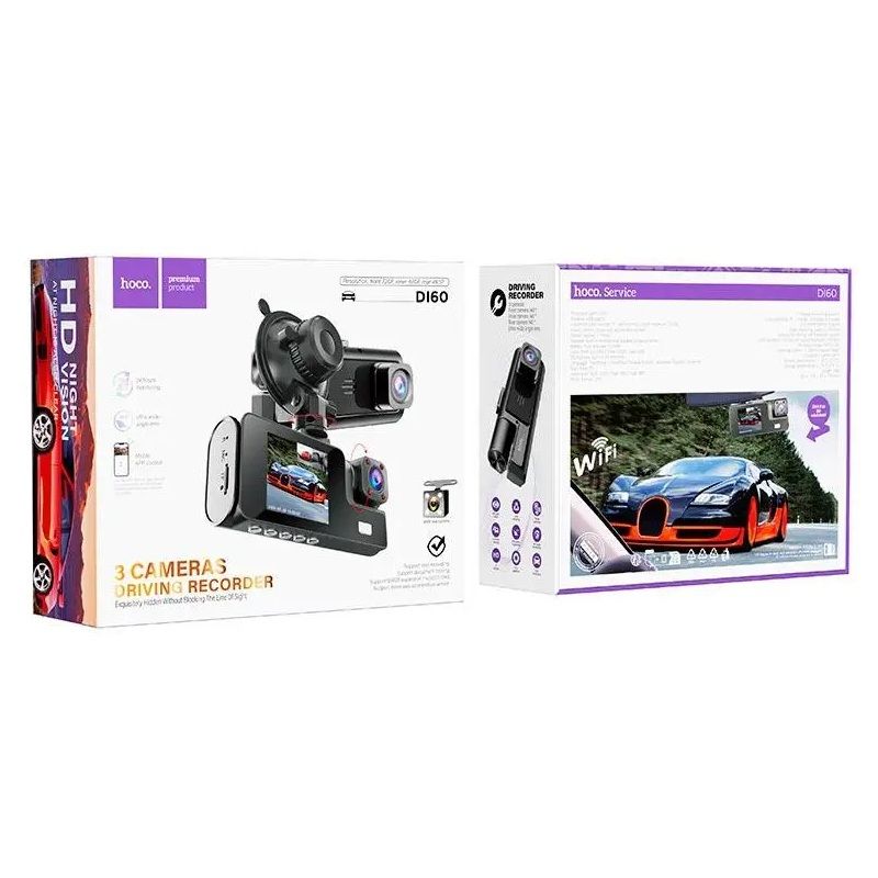 HOCO DI60 — это современный автомобильный видеорегистратор с тремя камерами, предназначенный для одновременной записи передней, задней и внутренней обстановки автомобиля. Благодаря трёхкамерной системе устройство обеспечивает полный визуальный контроль дорожной ситуации, происходящего в салоне и пространства позади автомобиля.