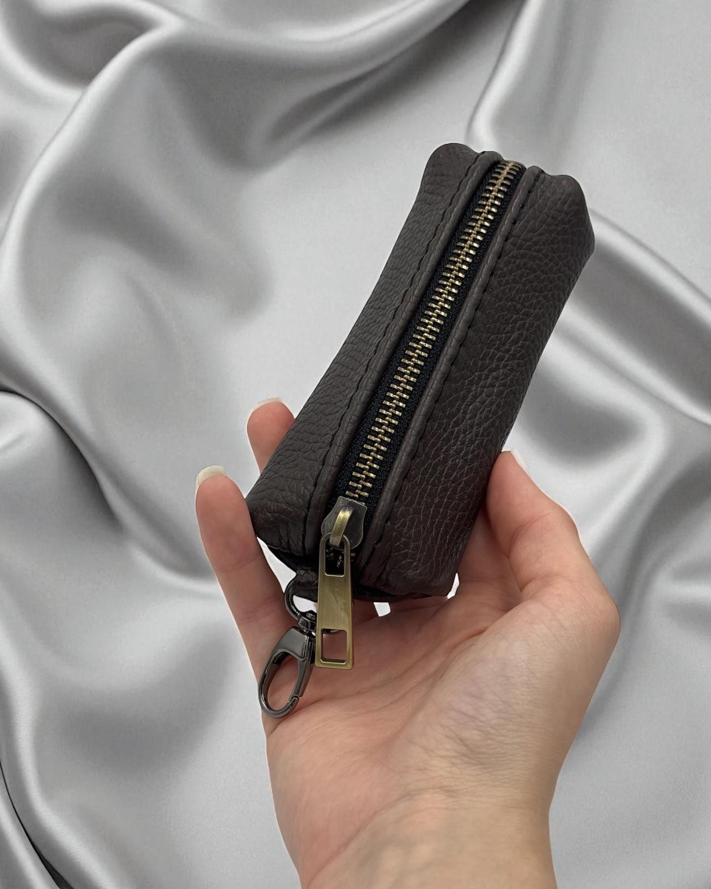 Вишукана ключниця із натуральної шкіри преміум-якості — це поєднання естетики, надійності та зручності. Її гладка поверхня з природною текстурою приємна на дотик, а міцні шви забезпечують довговічність аксесуара. Металева фурнітура з покриттям «нікель» додає витонченого блиску та гарантує зручне закріплення ключів. Оптимальний розмір normal дозволяє легко носити ключницю у кишені або сумці, зберігаючи ключі в безпеці та порядку. Ідеальне рішення для тих, хто цінує стильні та функціональні деталі в повсякденному житті. СТРУКТУРА: • одне основне відділення на молнії • металеве кільце для кріплення ключів • карабін для кріплення ззовні ХАРАКТЕРИСТИКИ: - Матеріал: натуральна шкіра КРС - Вид шкіри: зерниста - Тип моделі: ключниця - Фурнітура: металева - Розмір: (В*Ш*Г) NORMAL-12см*5см*2.5см