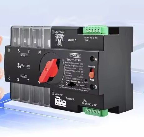 На din-рейке. Tomzn фирма, модель TOQ7-125/4. Переключатель из 3 фаз на 3 фазы. С нейтралью. (4 полюса).