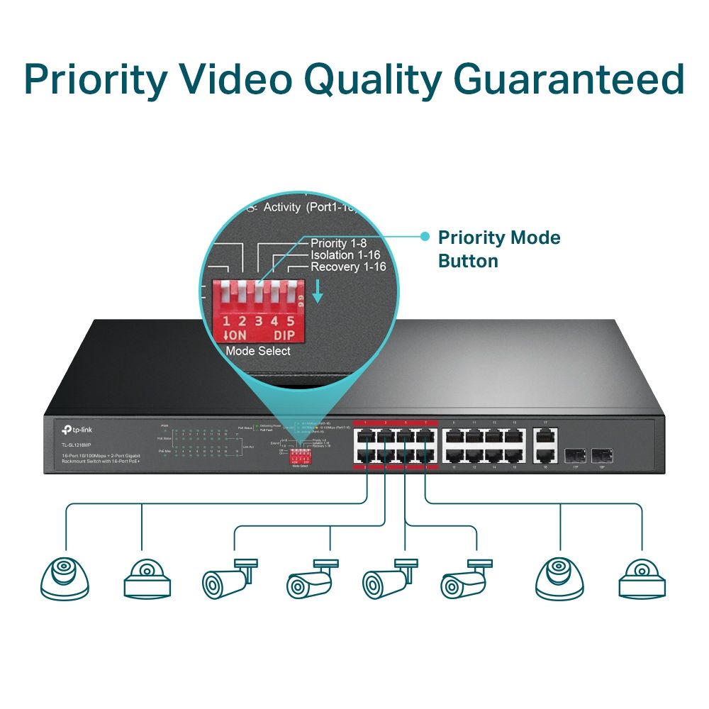 - Режим приоритезации в один клик выделяет порты 1–8, гарантируя стабильную и качественную передачу данных для критически важных приложений, таких как видеонаблюдение и системы безопасности.