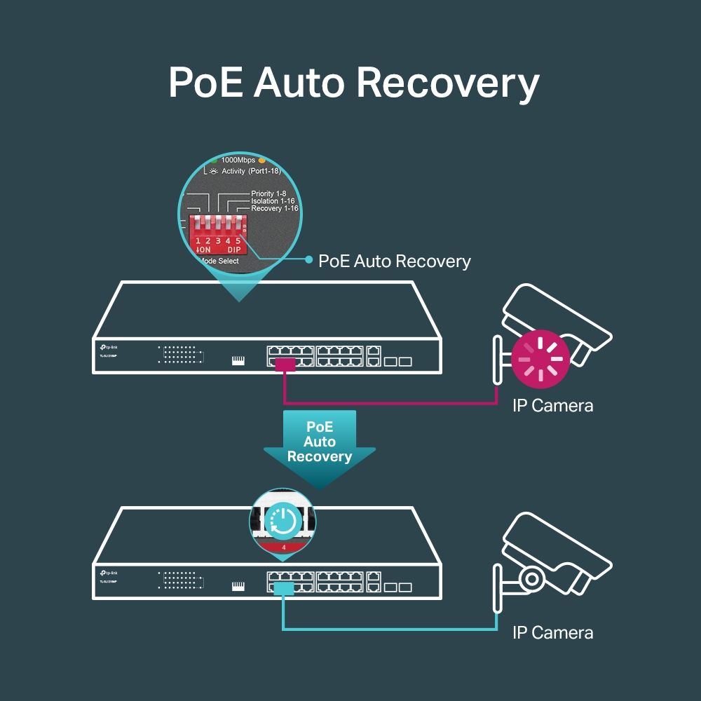 - Этот коммутатор автоматически обнаруживает зависшие или отключённые PoE-устройства и перезагружает их без участия администратора, обеспечивая бесперебойную работу IP-камер и точек доступа.