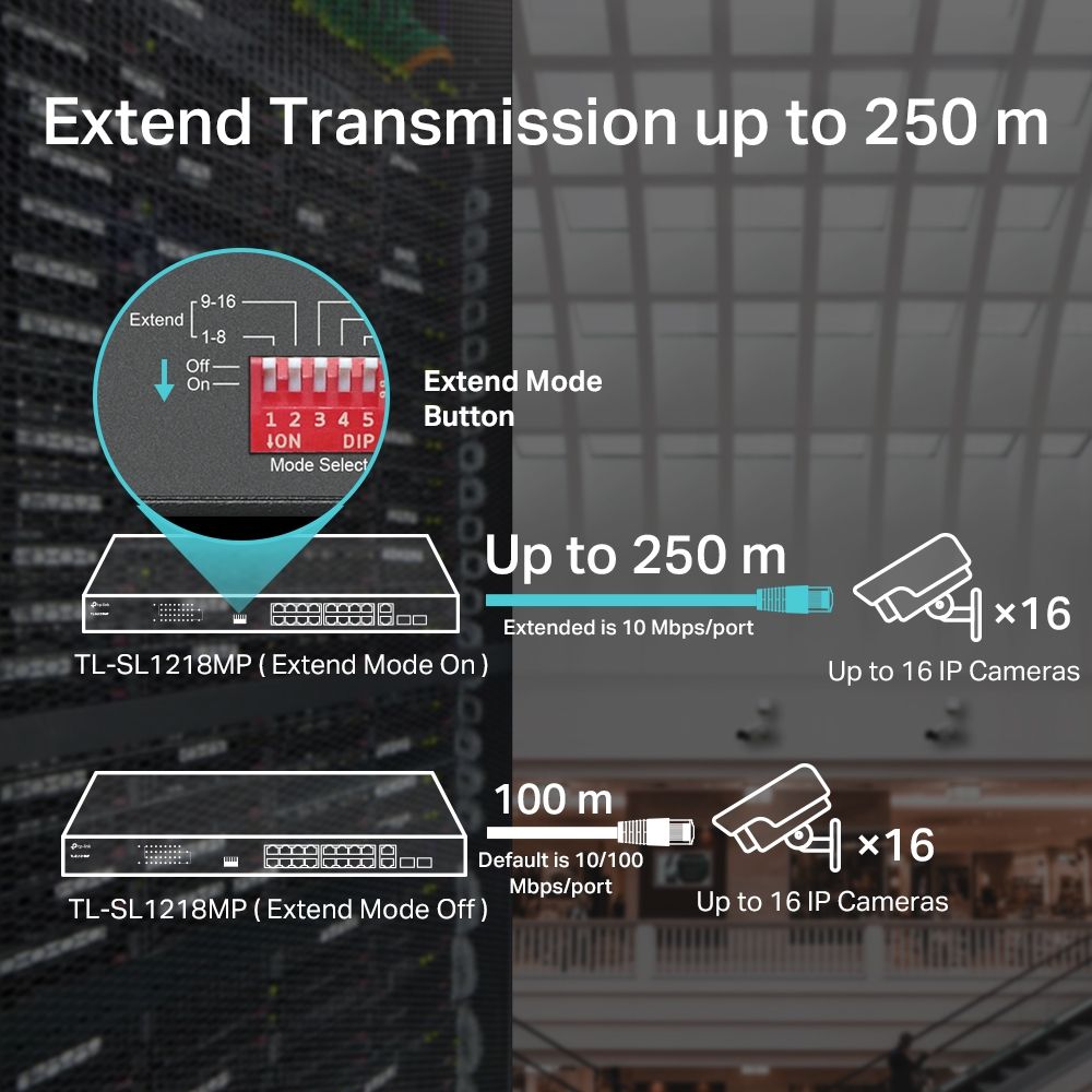 - Специальный режим расширения обеспечивает передачу данных и питания на расстояние до 250 метров, что идеально подходит для систем видеонаблюдения на больших территориях. В расширенном режиме скорость портов составляет до 10 Мбит/с.