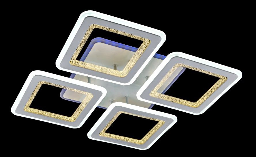 Люстра оснащена четырьмя плафонами в форме квадратов, выполненными в белом. Эти плафоны рассеивают свет мягко и равномерно, создавая приятный световой эффект. Цвет белых плафонов придает помещению свежесть и чистоту.
