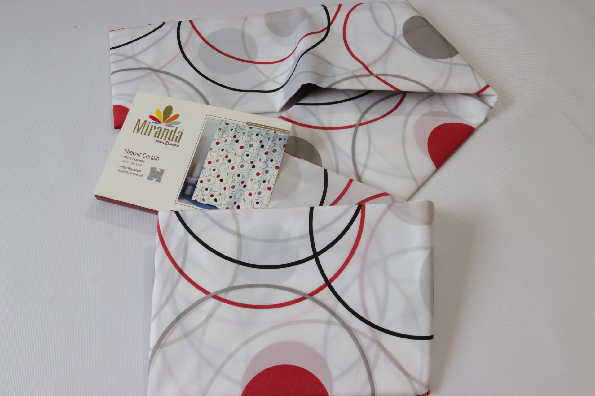 Ванная комната и занавеска для душа Miranda производства Турции. Состав 100% полиэстер (ткань с водоотталкивающей пропиткой). Отличное качество, не теряет первоначального вида даже после многократных стирок. Отверстия для колец выполнены из пластика. Кольца в комплект не входят, их можно приобрести дополнительно.